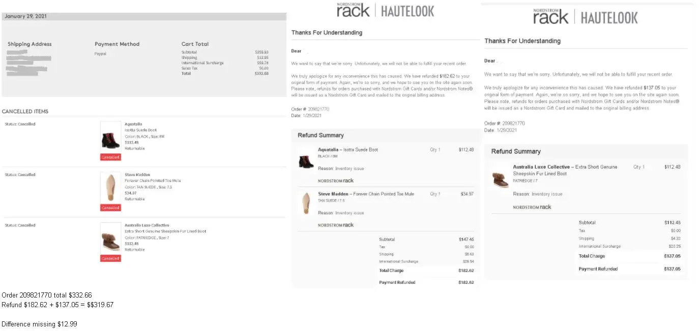 In the last 3 months, i've had about 10+ orders cancelled due to inventory issues but that's only part of the problem. Each and every one of those cancelled orders, I did not get the proper refund hence, I had to contact customer care a lot to get these rectified. That is time wasted. Not to mention having to wait days for my $ to be refunded. It is a bit odd that it's taking months for nr to fix a "system glitch". This is very frustrating and have caused so much inconvenience to the point that I will no longer shop online here. I keep hoping my next order will go smoothly but i've given up after 10+ cancelled orders and inaccurate refunds. I've voiced out my feedback and concerns to customer care but most of them do not care. Only a handful would go above and beyond and actually process the refunds asap. Most say I have to wait 3-5 business days for my correct refund but I know some just process it through right away so I know it can be done. I am still waiting for my full refund on order [protected] $12.99. And my full $70 gc from orders [protected]/[protected]. These are not big $ so I don't understand why I have to wait so long for my money to be refunded when it's nr's fault. This very aggravating and disappointing.