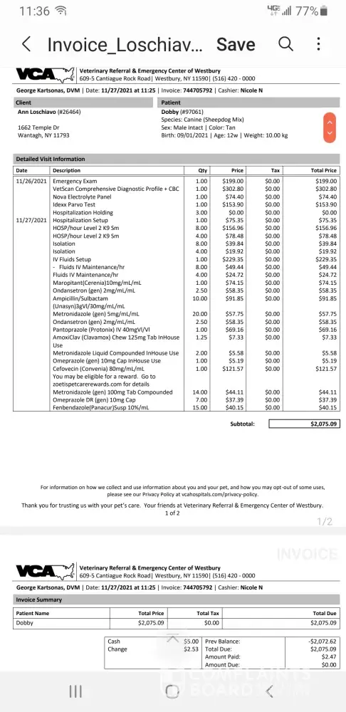 Adoption 11/19/21 of 10 week puppy on 3 separate meds for parasites. On 11/26/21 pup collapsed on floor in my home & unresponsive. Took to emergency vet immediately 9pm & was tested positive for Parvo, treated 12 hours for $2072.00. Transferred pup to animal league next morning & hospitalized 3 additional days. Pup was sick when I took home, parvo has 14 day incubation period & he was only with me 7 days.