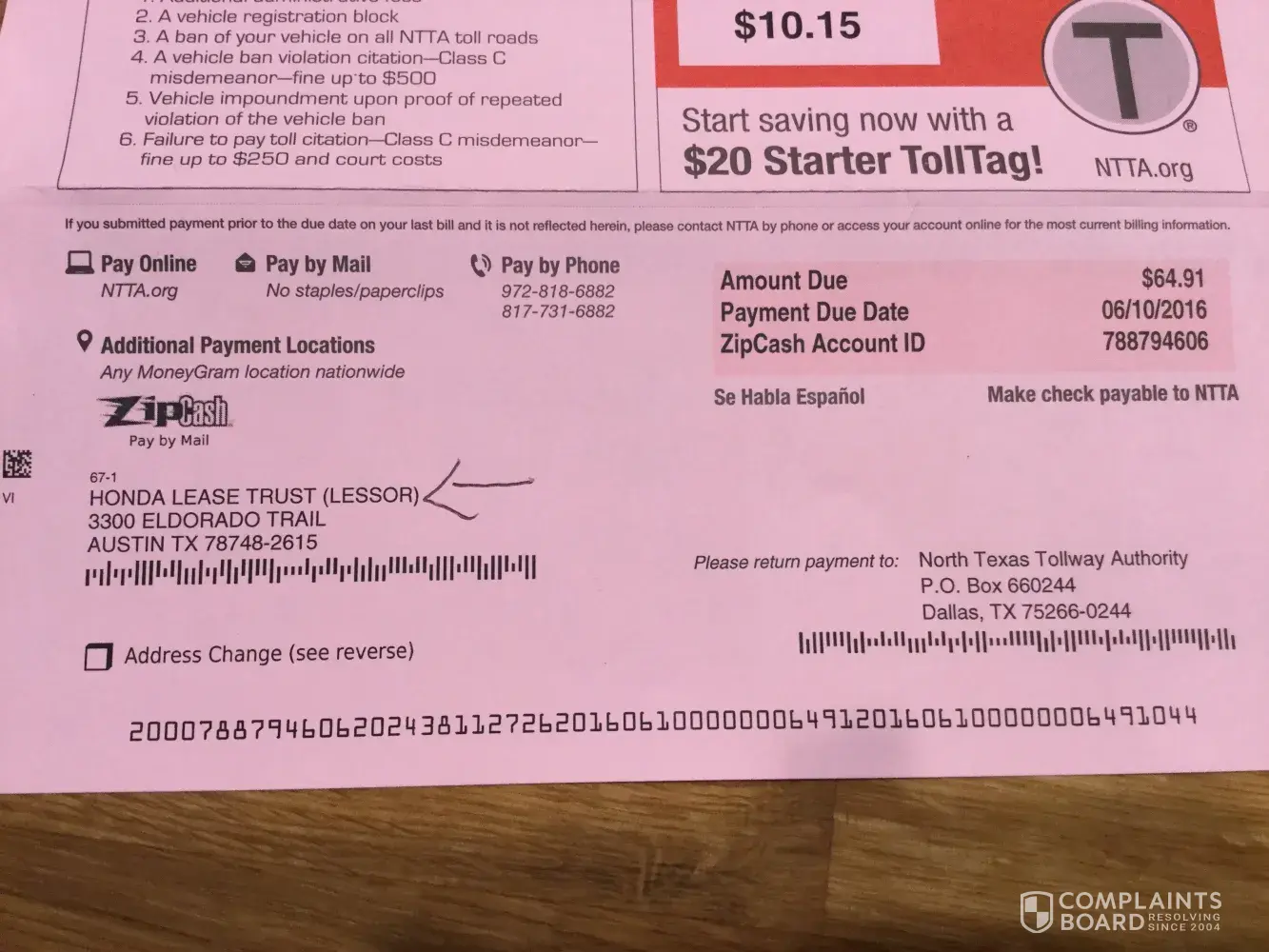 On the 12/19/16, I called NTTA to take care of a "Zipcash" invoice that was sent to me since I was advised my Tolltag account had gone to -$0.70 and since there was no card on file, it billed as Zipcash.