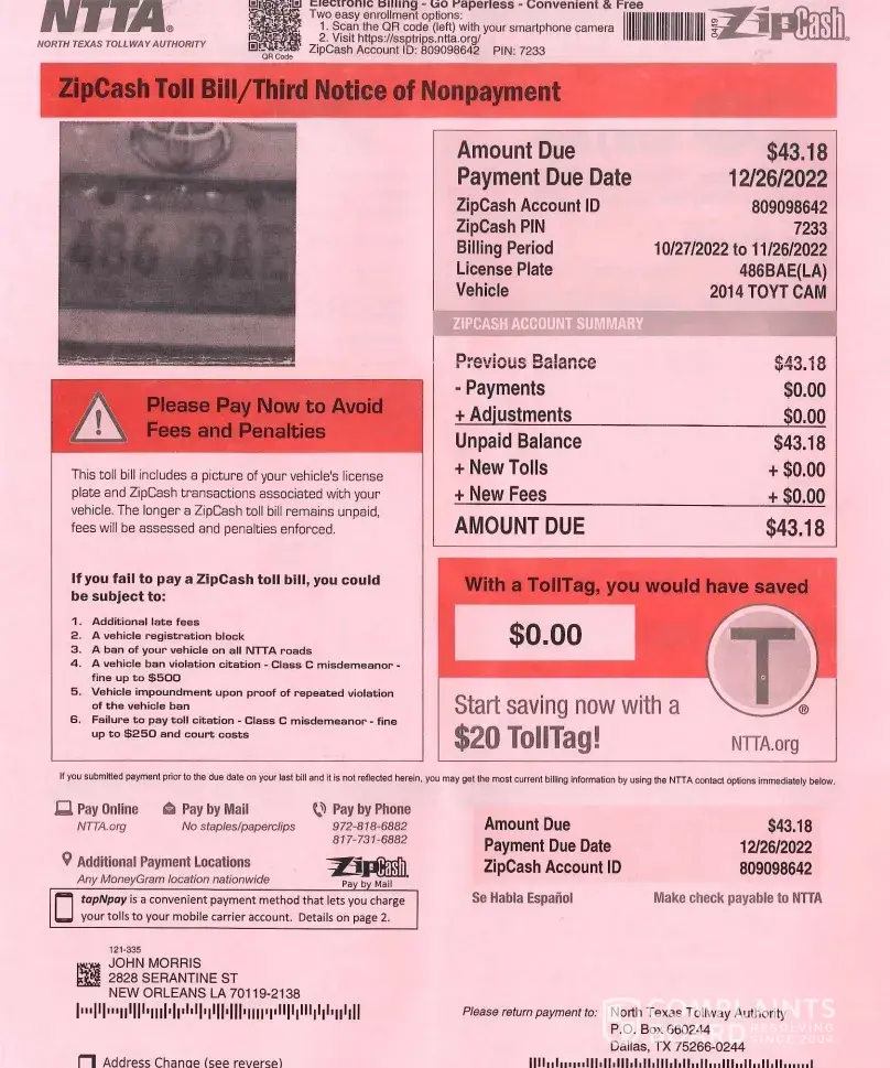 :Notice if you drive down the Dallas North Tollway for around 20 miles you will approx land yourself with around 125$ in fines, if you do not pay these fines you will be subject to higher fines and then a warrant for your arrest will be issued.