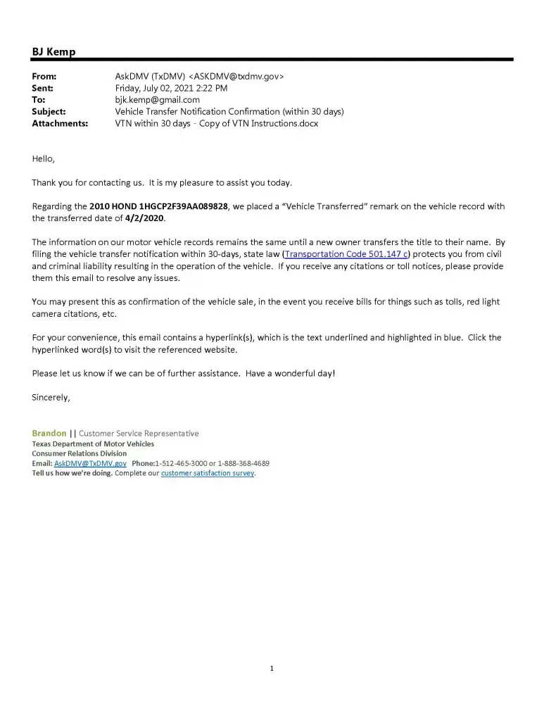 They continue to bill me and send me to collections over a car we no longer own. I have repeatedly contacted them about this vehicle. We sold it on November 8, 2020. A notice of transfer was filed with the TxDMV the day it was sold and I have sent them a copy of this verification as well as the bill of sale. I have contacted the TxDMV and they told me to not pay anything because that notice of transfer protects me from any violations or crimes involving this vehicle. How do I get this to stop? If this does not work, my next step I can only think of is to contact an attorney.