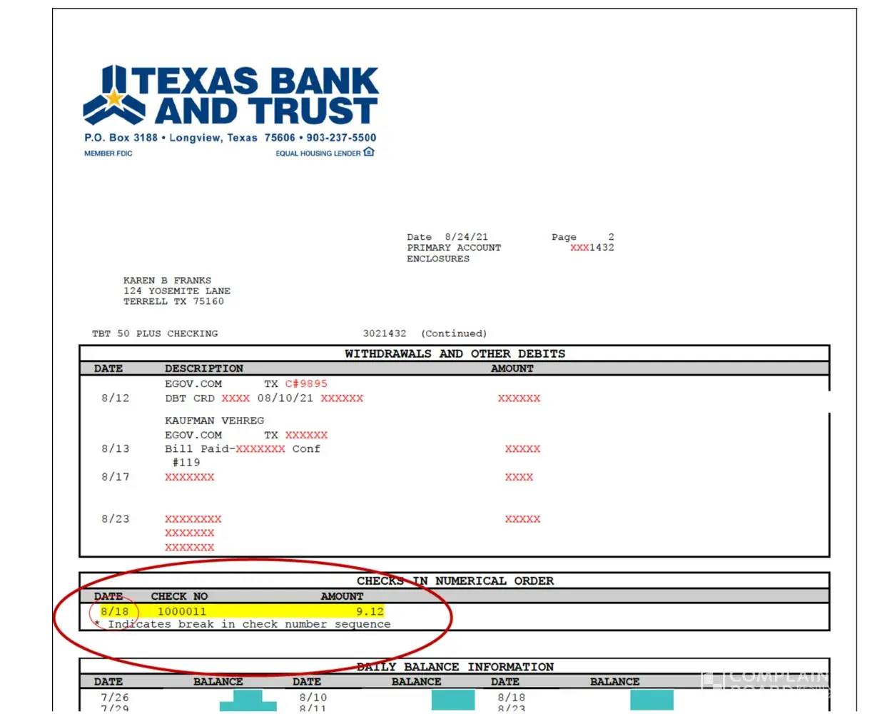 I received a bill for $9.12, due on 18 August 2021. I mailed payment on 12 August 2021. It cleared my bank on 18 August 2021.