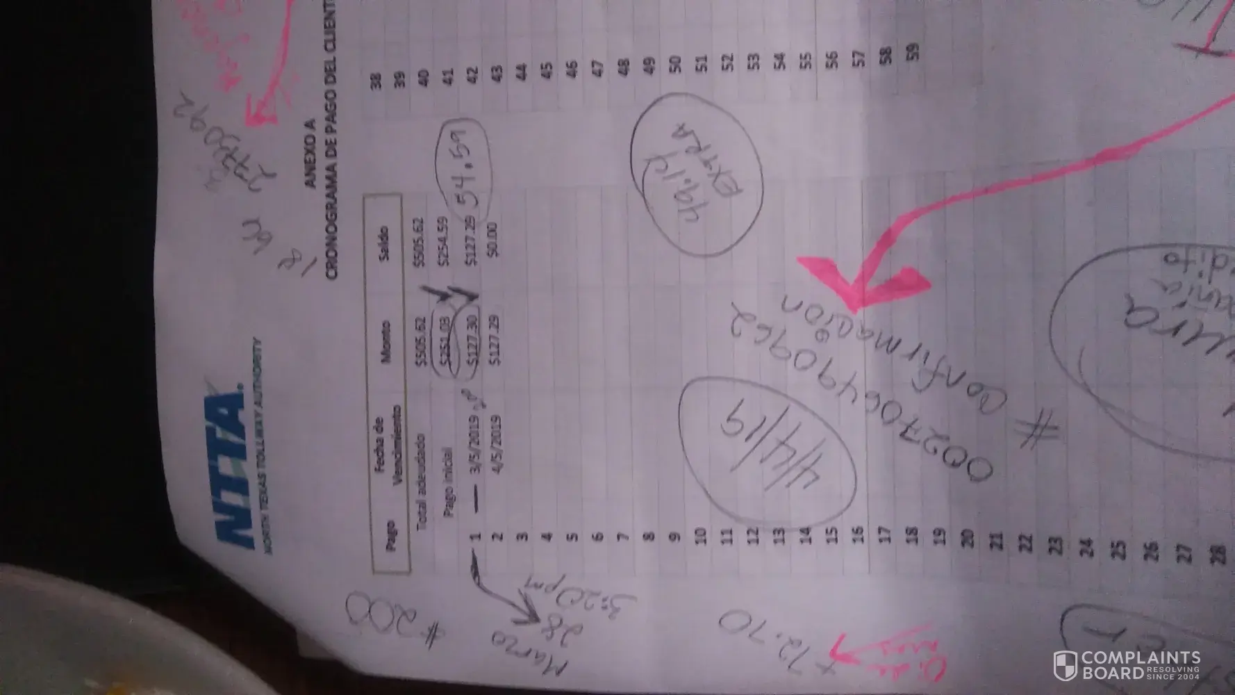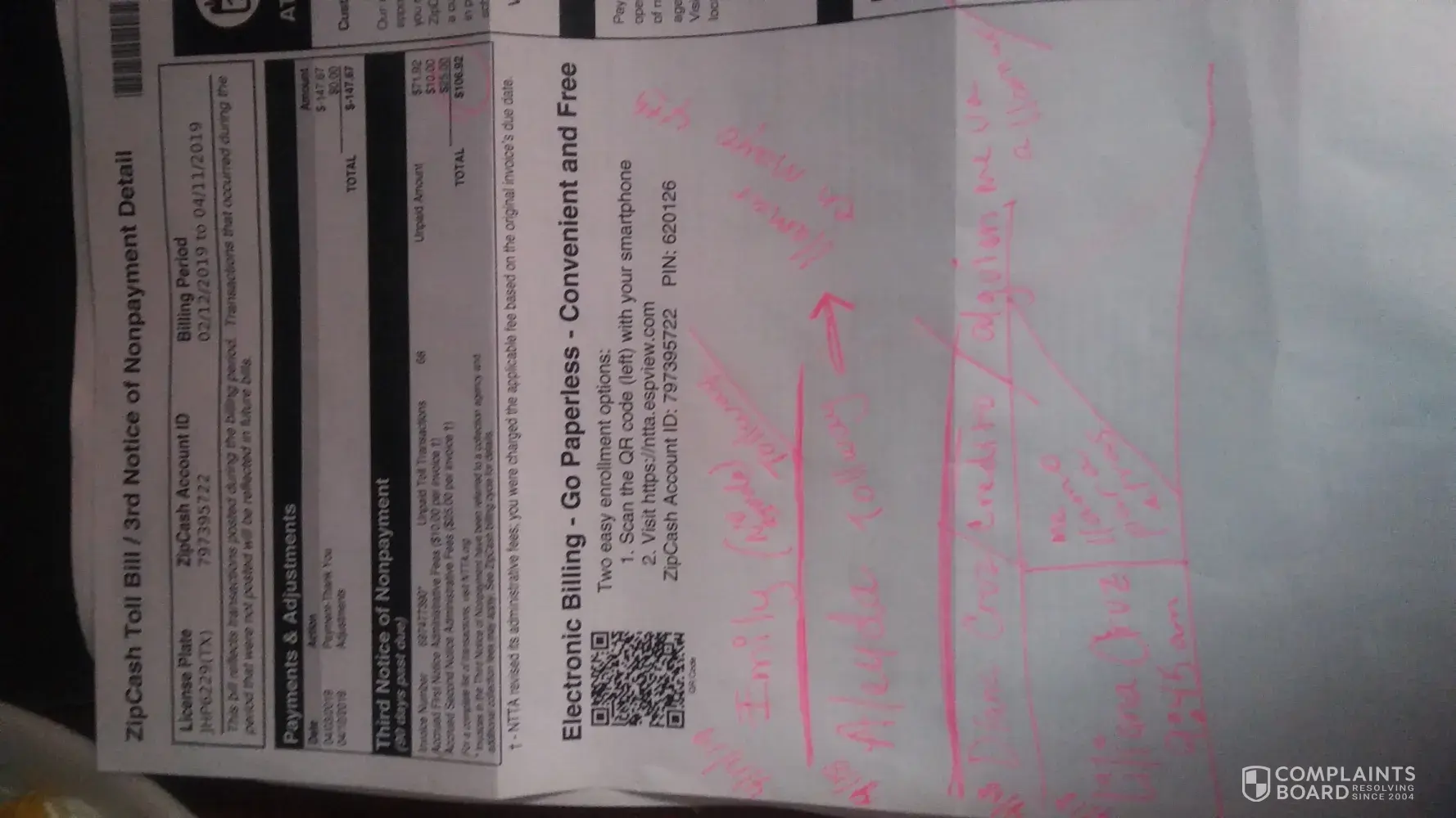 I was calling and calling several times for make my other payment but they can't find me on the system... finally on 3/28 Diana Cruz from collection agency call me and took my pay for $200.00 after that my balance supposed to be $54.59 but instead they give me balance of $103.73 which I don't understand where they have the extra $49.14... I been talking with a lot people and they can't help me... I already paid the $54.59 on 4/4/19 with someone called Laura... I talked to Esther superviser of ntta and she told me that everything was ok... but now I receive a zip cash 3rd notice of nonpayment for $106.92 I called talked with 4 different pro people... don't know what this people play but... nobody can't help me really!