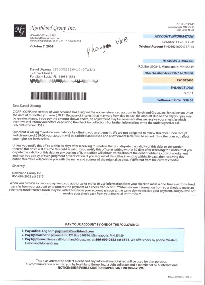 I was about to pay this amount when I decided to Google Northland Group, Inc. and check them out. SCAM, SCAM, SCAM. I found way too many complaints that this was just another scam company trying to bilk people out of their money. I am tired of these companies who illegally scam financially struggling people. I am reporting them to the Better Business Bureau (BBB) and to the International Commerce Commission (ICC).