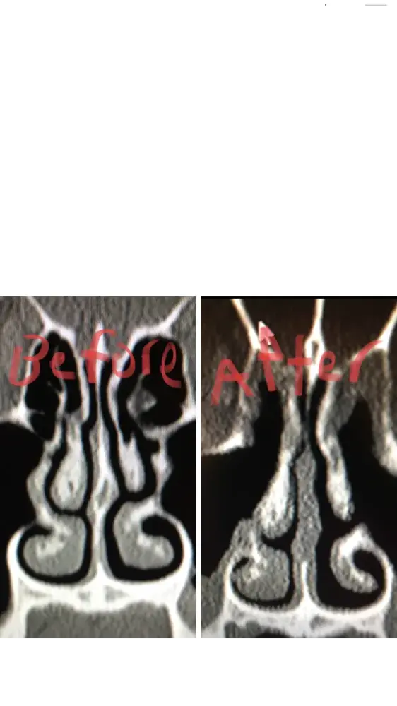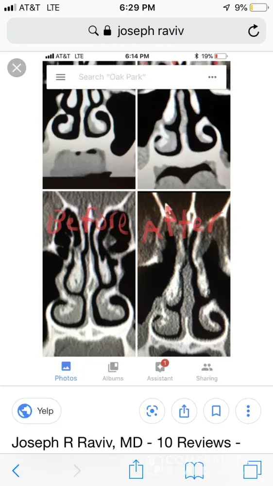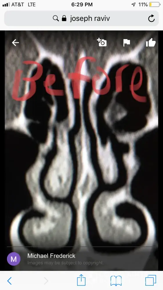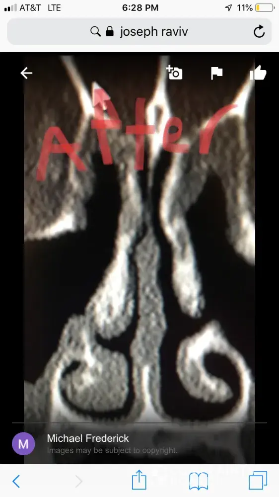 Dr Raviv performed two surgeries on me: endoscopic sinus surgery (where they widen the sinus passages), and septoplasty (where they straighten the septum). The septoplasty, however was completely unnecessary, and severely narrowed the right side of my nasal airway. For people reading this, I have included x-ray images of my sinuses, before and after my surgery with Dr. Raviv. As you can see from the surgery, my airway was much more open, and equal on both sides, before my surgery with him.