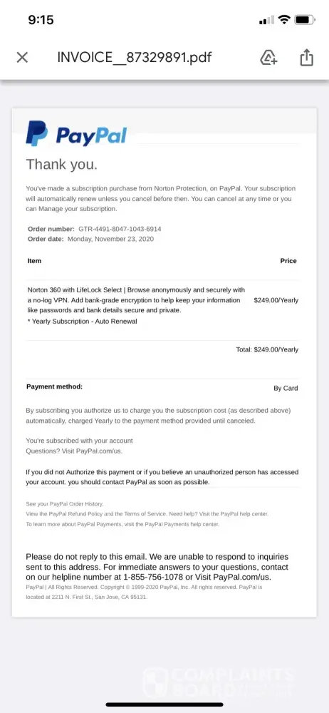 I was notified today that PayPal authorized Order number GTR-49911-8047-1043-6914 on 11/23/2020 for $249 for Norton 360 Lifelock.