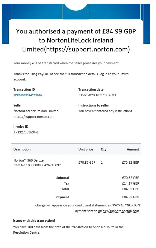 Norton unauthorised payments