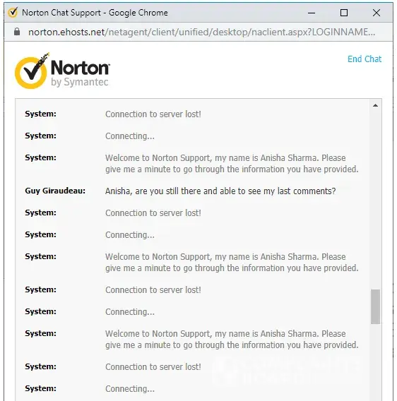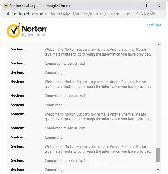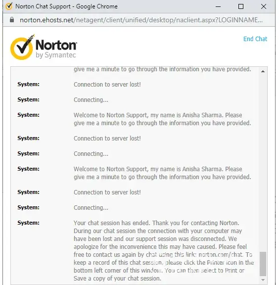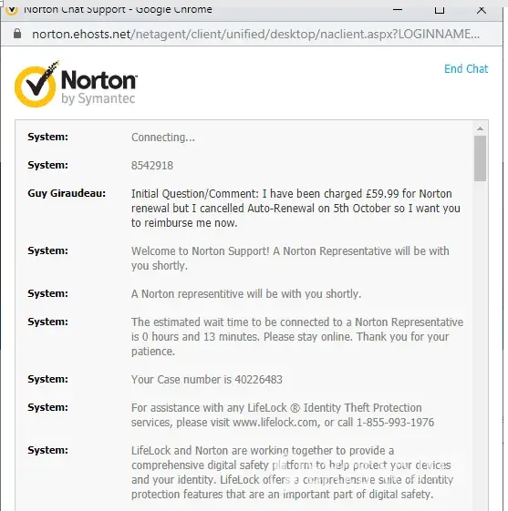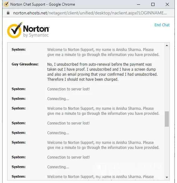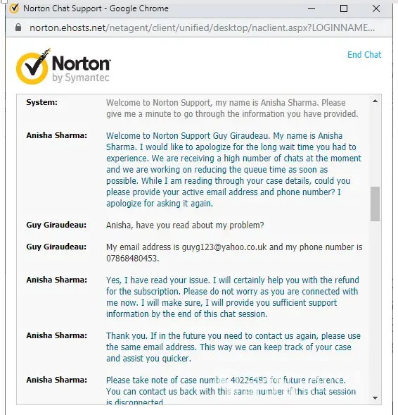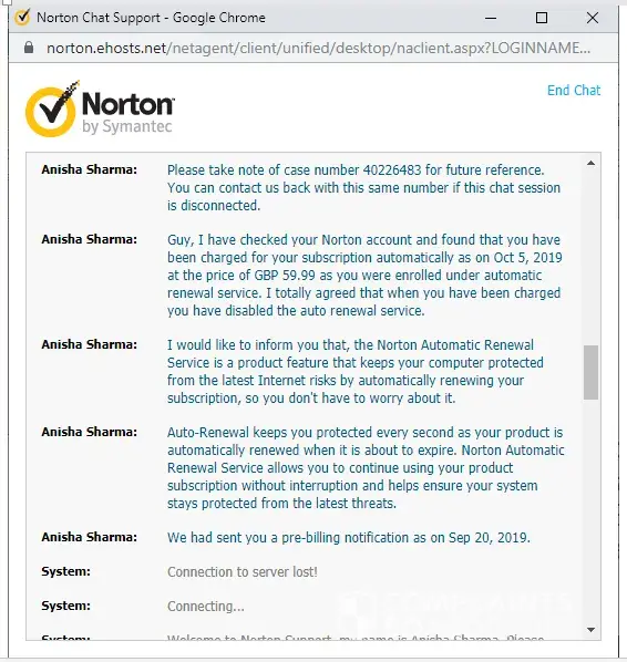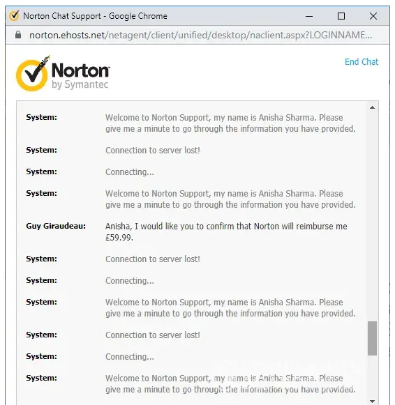 This morning I went onto Norton's chat facility and was given case [protected]. I explained to Anisha Sharma that I had been incorrectly charged £59.99 and that I wanted to be reimbursed. In the middle of our exchanges, the chat began to be interrupted by the connection to the server losing then re-establishing a connection so I was unable to complete my conversation with Anisha. The chat was ended from the Norton side.