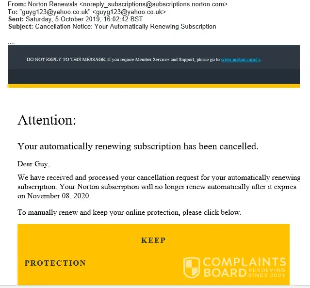 I received an email from Norton confirming that my auto-renewal had been cancelled. However, my wife recently looked at our credit card account and Norton had charged the account £59.99 on 8th October.