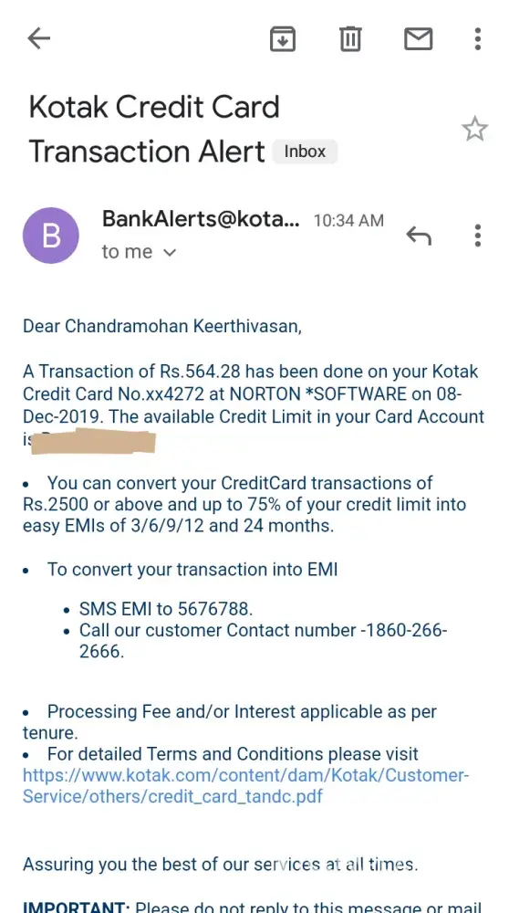 I use Visa credit card given by Kodak Mahindra Bank. Today(08-Dec-2019) I have received a SMS and mail from Kodak Mahindra credit card section stating that "sum of amount(****)has been debited from you credit card account by NORTON *SOFTWARE" on which i never had an account or associated with. This is the first time something like this has taken place. Please, Help me on this.