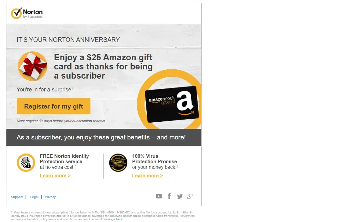 The only thing I ever get from norton is computer security and have always paid for this on the same day