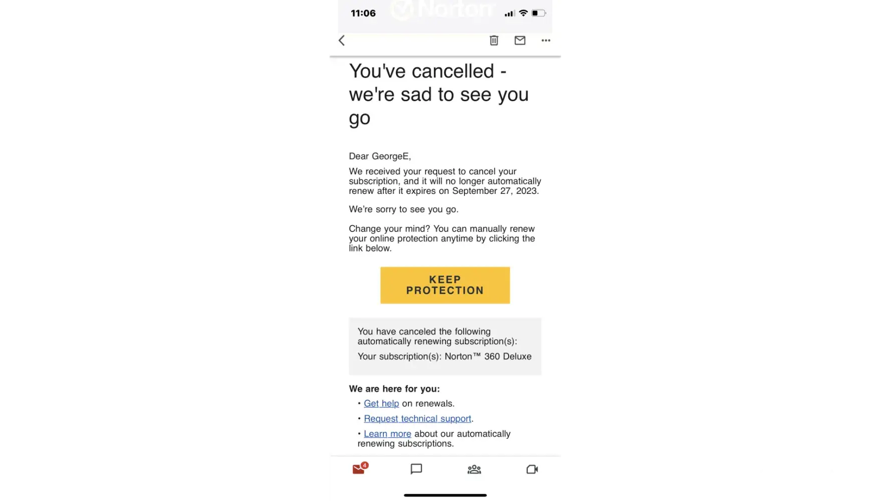 The amount was balanced [protected] but charged for a second time on that same date. The charge was disputed and dismissed by Renasant Bank, 10-31-2022. Cancellation notice states will no longer renew on expiration September 27, 2023. Bank does not recognize September 2022 cancellation notice state Why did Norton again charge? Please cancel and refund $112.34.