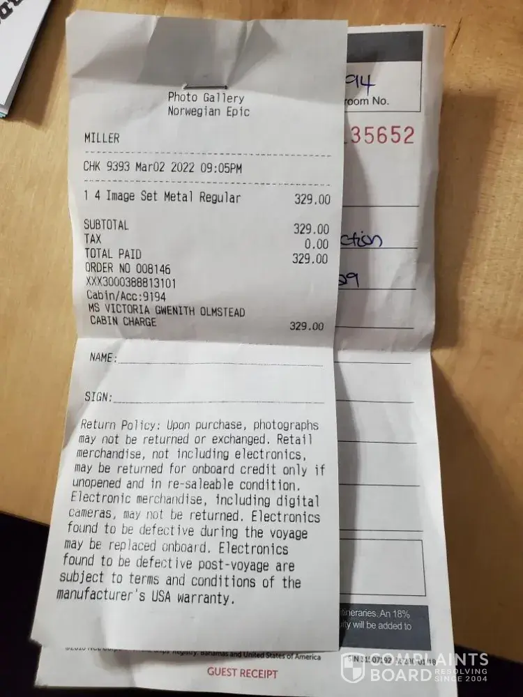 My daughter, Victoria Olmstead, had a vow renewal ceremony on Feb 28th of this year. She ordered a 4 picture metallic artwork at that time and, of course, paid for it. I am attaching the all documentation that shows her purchase. She was told at the time it would be delivered within 6 to 8 weeks. We are now at week 14 and no one has provided her any information about the status of this item. I don't understand why your company is so lax about servicing past cruise issues and the fact that you cannot talk to a person in Guest Services after you have cruised to address open items is terrible customer service.
