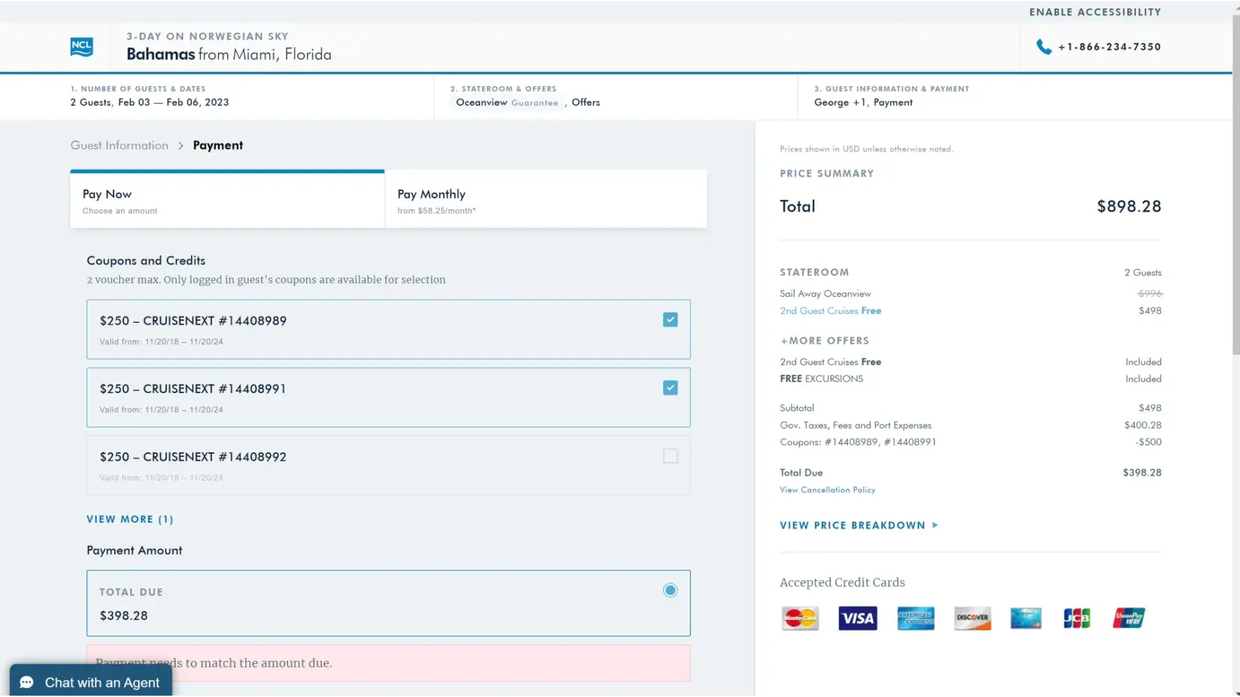 I made a reservation for a cruise on Norwegian Sky on February 1st, applied coupons, was quoted a price to pay. I entered my credit card info and clicked finish and pay.