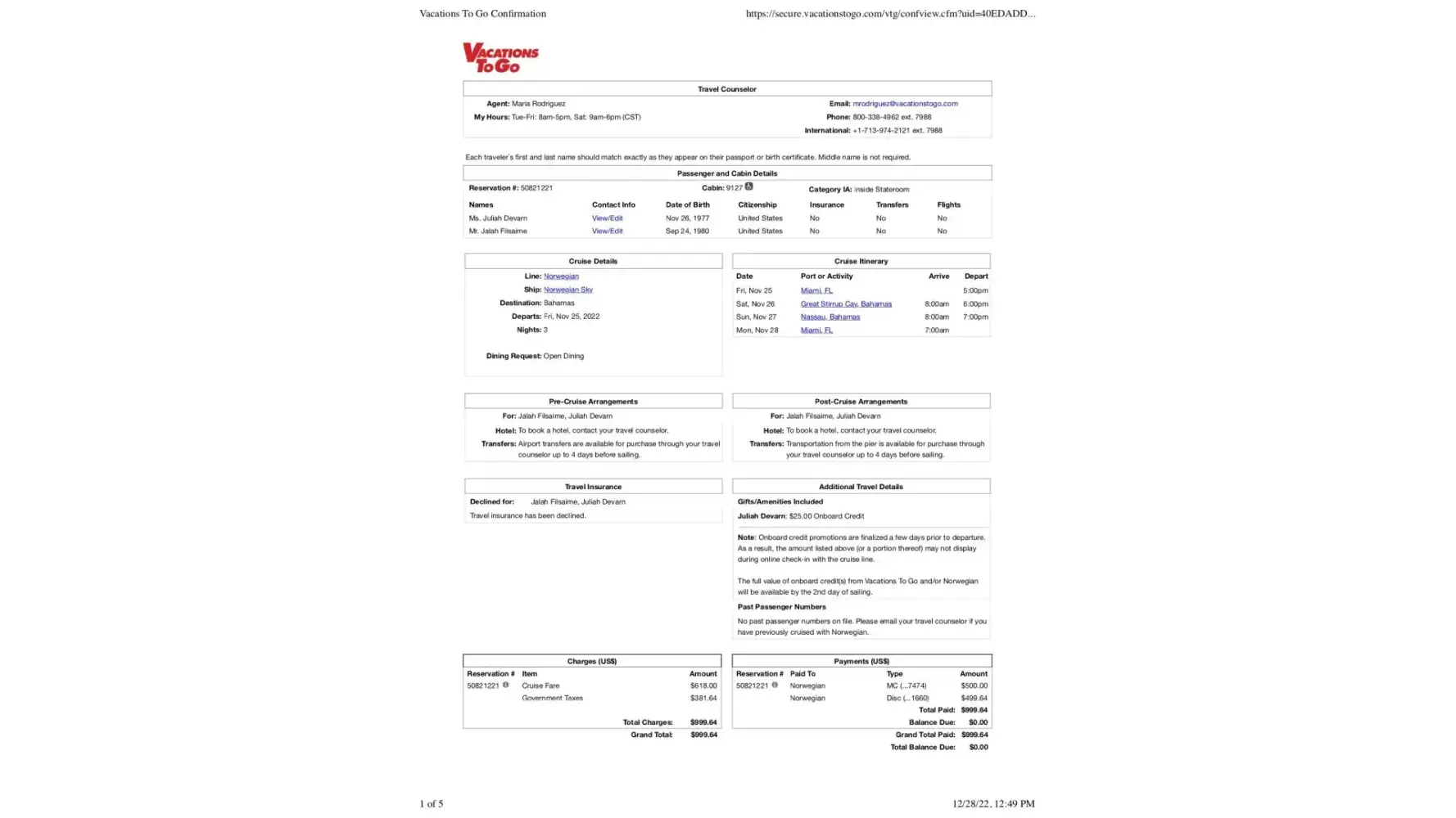 12/2/22 FINALIZED our cruise after several calls to several people. We received wrong info in regard to $99.00 add on 3rd person. My husband is 90 years old; he scheduled this trip as it may be our last. We were told to call back when 3rd person verified, she could in fact join us so she could help me through the trip.