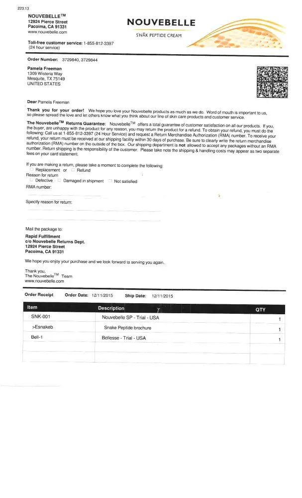 They have an add on Facebook for a "FREE TRIAL" bottle. It does not say they are sending you a full size bottle. Then they claim that there is a 14 day trial period. They also do not say that this starts from the time that you order, not when it ships or arrives. On their Web Site it tells you to take a photo of you on day one and then again on day 14 to see the results. So if there is a 14 day period for you to try the product and it starts from the time you order, there is no way to get your money back. Also, before you get out of the order process, they con you into a "FREE TRIAL" of Bellesse Eye Serum. I ordered my "FREE TRIAL" on 1-8-16. Product was delivered 1-15-16. Packed in the box with the bottles is a note telling you how to get an RMA number for a return. It tells about how you have to have the product back to them by 30 days. When you call to get the RMA number they tell you it is to late BUT they can offer you half price. If you do not take the half price offer, they will let you ship it back and you pay shipping & handling and they charge you $20 each for processing. i was charged $97 plus $4.95 plus .99 cents for Nouvebelle & $93 plus $4.95 plus .99 cents for the Bellesse. They came in the same box.