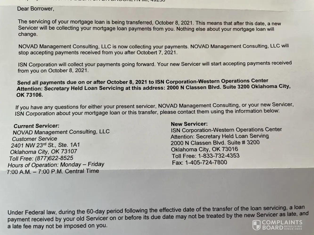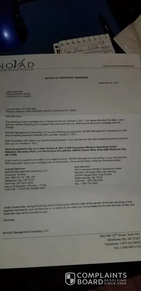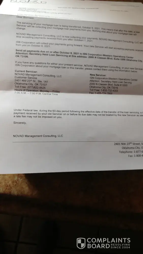 I received a letter dated September 22, 2021 stating my mortgage loan is being transferred from Novad Management Consulting LLC to ISN Corporation - Western Operations Center October 8, 2021. Send payments to 2000 N Classen Blvd, Suite 3200 Oklahoma City, oK 73106. My loan is not/has never been serviced by Novad Management Consulting, LLC. Novad toll free...