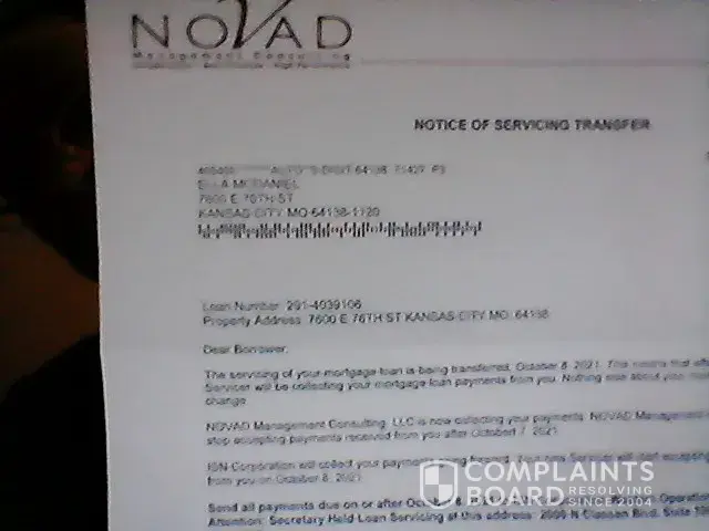 Today I received a letter from NOVAD Management Consulting, LLC telling me that as of 10/08/2021 all mortgage payments are to be sent to ISN Corporation-Western Operations Center. First of all, I never had NOVAD Management Consulting LLC as the company collecting my payments and I have never heard of them. Secondly, the referenced loan number is not even...