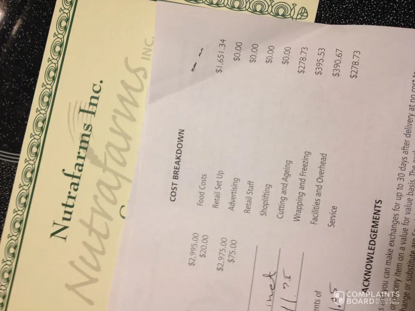 A Nutrafarms rep came by a few weeks ago and we got roped in by the sales pitch which is essentially nothing but a huge lie as far as the amount of product you receive for the price you pay. The sales rep advised that the order typically lasts for 10 - 12 months. After we discussed with him at length what we tend to eat and how often, he said that we'd maybe get a bit less out of the product, maybe 9-10 months, because we tend to choose more expensive cuts and don't eat tons of ground beef. Ok, fine. The math still sounded reasonable, and we expected it would be a little more expensive than grocery store prices, but the quality of the meat would be better etc. etc. and so we decided to give it a try. This was not one of those situations that sounded too good to be true. It sounded reasonable. After we received the order (they also sent a freezer) I packed it away and we started trying some of the items. The quality was definitely good, I have no issue there. After about a week I calculated the value of what we had received. I did this two ways. First, I went through the entire list of what we received and put a price on the each item, adding a buffer of around 10% above what we'd pay generally from Farmboy. Then, I calculated the number of meals that the delivery would provide, for a family of two. i.e. two pork chops = 1 meal. Both methodologies arrived at the same conclusion. Price-wise, we calculated the value of the product we received to be around $1, 600.00. This is around 40% of what we signed up for. Meals-wise, we calculated the product received would provide 110 meals, which is roughly 3.5 months. What they promised was a $3, 600 value which would last 8-9 months. Both calculations indicate they have only provided around 40% of what they promised. Based on something the sales rep said, and some of the paperwork, we were under the impression that this sort of made sense and they would be calling us or we could call them to top-up the order periodically. "Hi, we're out of pork chops and strip steaks" sort of thing, and they would send over the next batch, keeping track of how much we had left. The itemized delivery sheet we received indicates the value of the beef package was $1042.45, chicken was $225.12 and pork was $396.70.