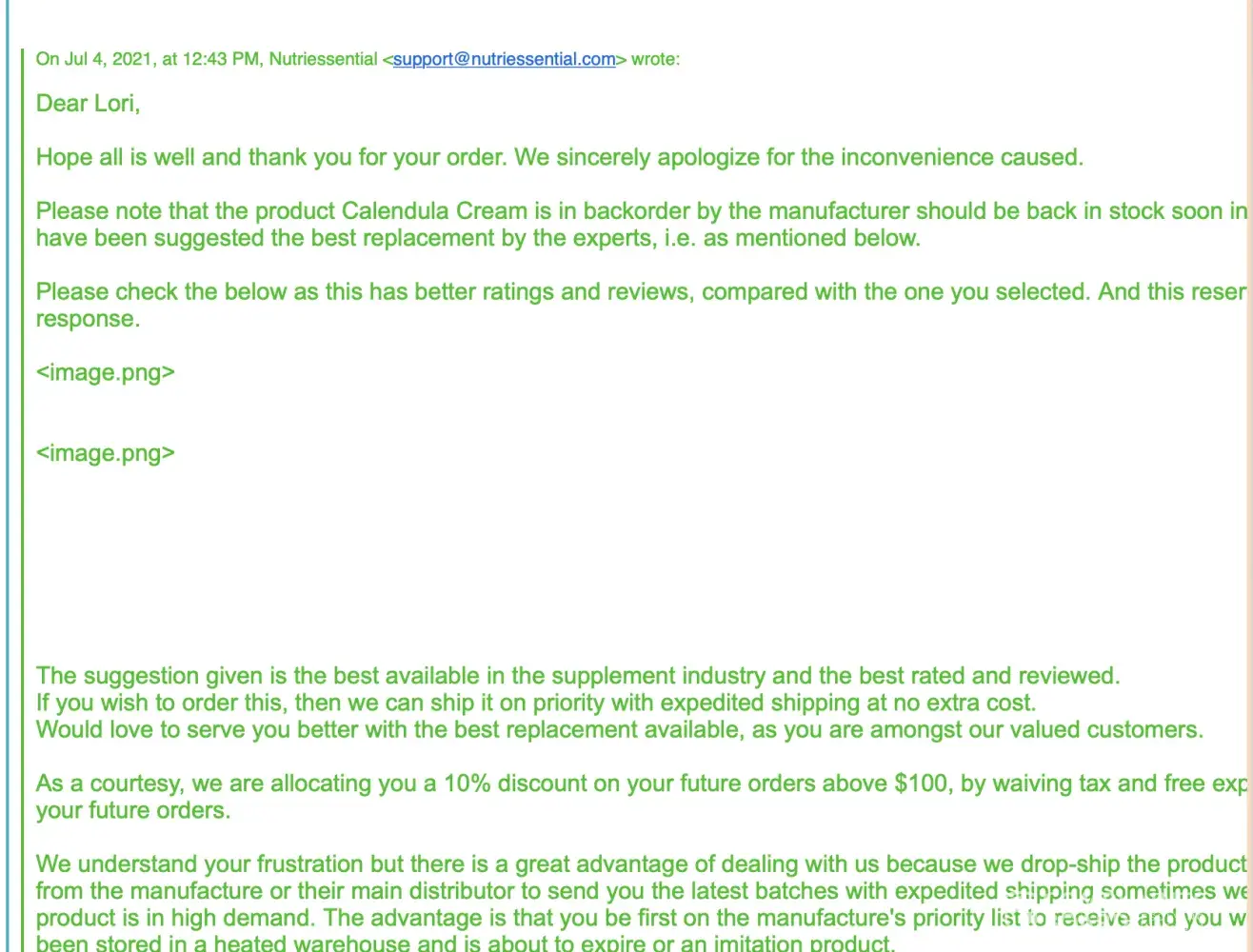 I ordered 3 products in November that were recommended by my homeopath for a protocol. She wasn’t familiar with this company, but they had one item I needed to have on hand so I decided to give them a try. Nutriessentials emailed to inform me one item was on back order and would be sent within the month. I cancelled the two items that were urgent and waited for the one that was on backorder because I could wait one month for that item. A month later it was still on back order and I needed that item so I had cancelled it and went with another company.