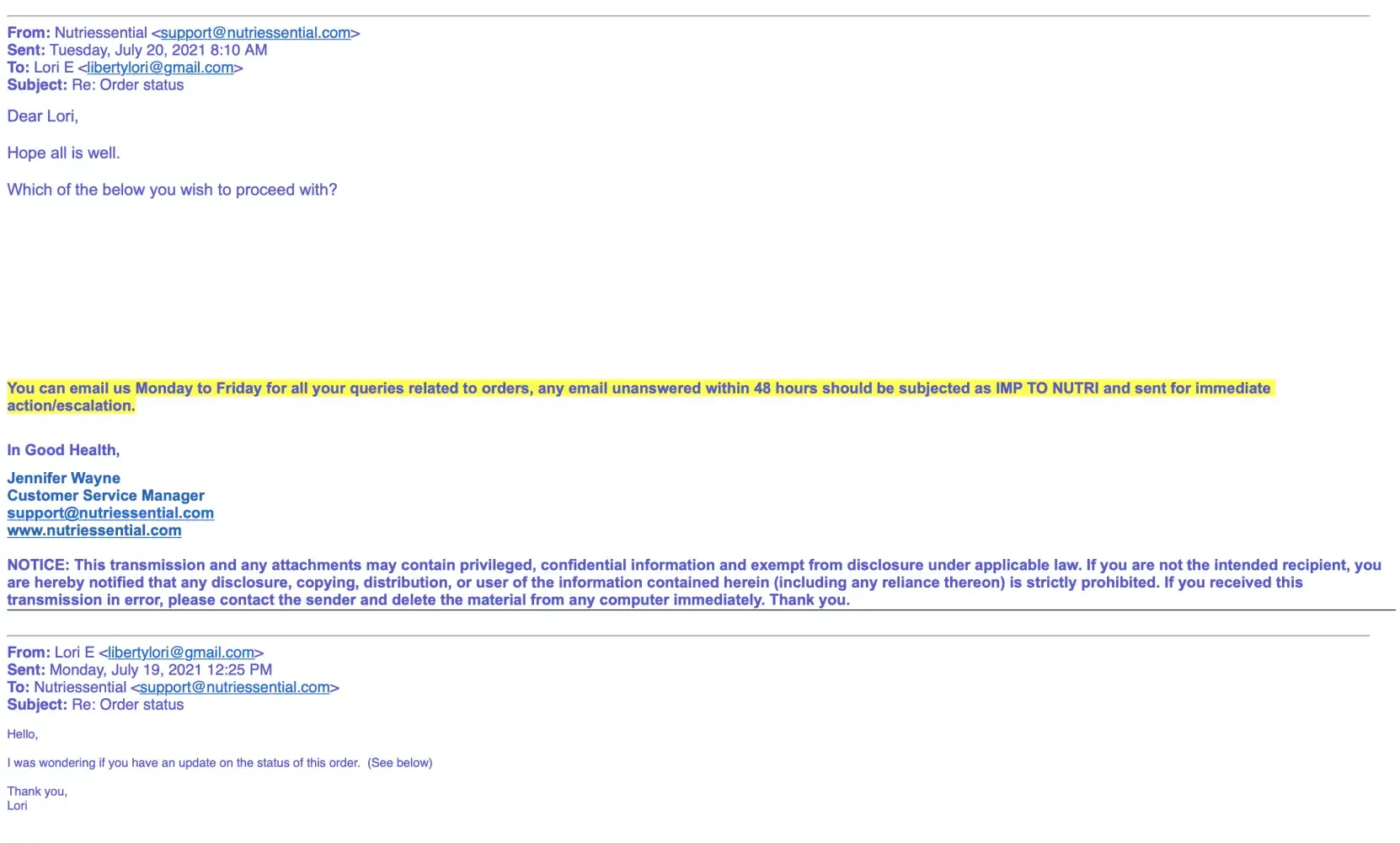 Mr01234 I recommend that you include order number if your complain is valid unless you are their competitor and trying to tarnish their good reputation to give the company a chance to respond to you as I have indicated in my comment before we dealt with Nutriessential for many years and never had issues that were not resolved immediately and i feel oblige to defend them since all the friends and family i referred this company to have only things to say about this company.