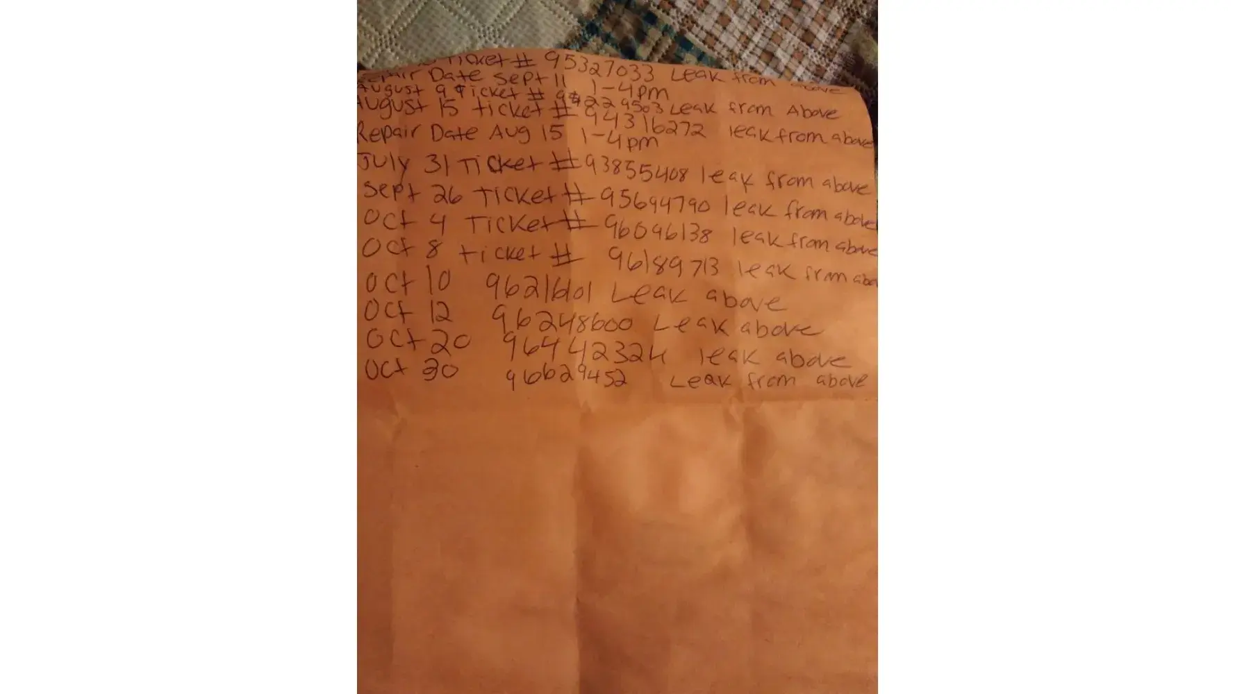 I live in nycha housing in queens with my legally blind mother and we have been having the leak in the bathroom issue from july 31 this year till today. I have been to the management office 4 times pleading with them to do something. I went down there monday and ms mathews told me the super was coming we waited all day never showed up at all they came the next day and gave us excuse after excuse. Housing sometimes doesnt even show up and if they do they go upstairs to 2c and flush the toilet and come back and say theres no leak and close the ticket the nect day it leaks again. I have a leak right now and my mother and I heard the toilet above sound like its clogged so we know its coming from them. They came down stairs trying to argue because we called the cops and the fire department to make sure there wouldnt be a fire and that was a problem. All of this would be avoided if they would just work with us to get this simple request fixed we never had any issues till they moved in upstairs. Housing only cares about you paying rent they could care less about your safety and thats against the rules what if I slipped or my mom got hurt because of their lack of compassion and understanding plesse help us I have attached pictures of the tickets and water ant the pipe above us