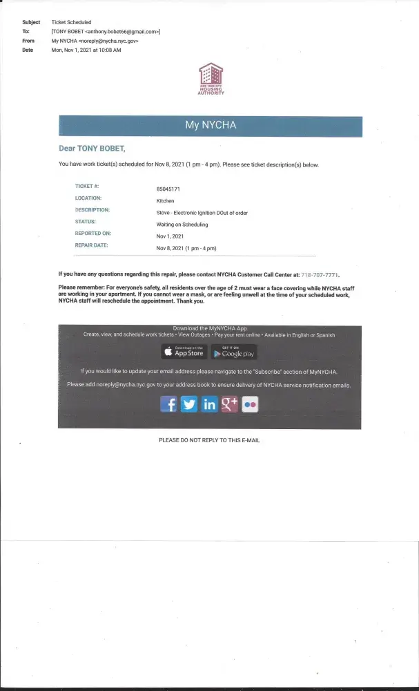Dear Sir/Madam: My name is Tony Bobet. I resided at 1710 Seward Avenue, Apt# 5-G, Bronx, New York City 10473. I am filing an complaint to New York City Housing Authority, local at 1720 Seward Avenue, Bronx, New York City 10473. The main reason of the complaint is that the Manager of New York City Housing Authority don't care for the tenant and no one else...