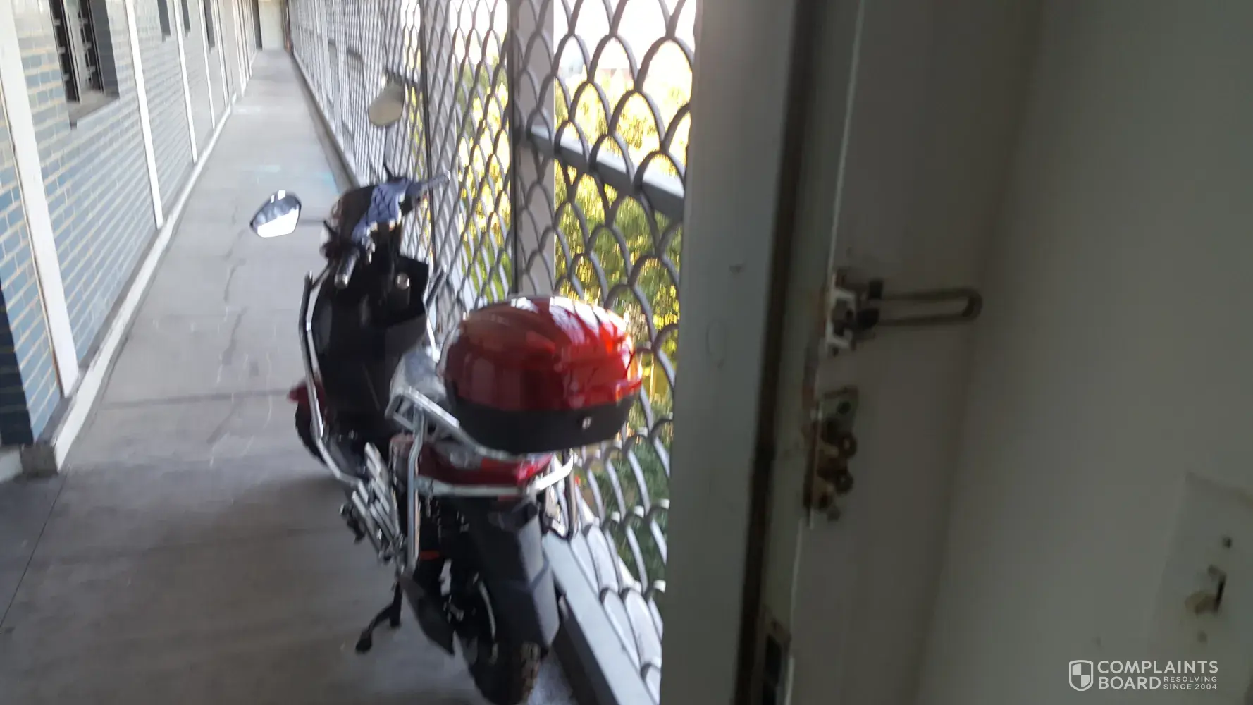 I have a complaint about a neighbor. At Marlboro Houses in Brooklyn. At building 2. My neighbor in apartment 10b has been smoking pot everyday at all different times of the day and has most importantly a motorcycle outside close to my door on the terrace locked on to the gate . He brings the the motorcycle at night so house rep don't see him bring it to the building. The problem is my brother is in a wheelchair & has a heart condition and breathing problem so that smoke comes in the house. Also in case of an emergency or a doctors appointment he will not be able to pass the motorcycle on his wheelchair their is not enough room. This is a young person who does not listen to anybody we have complained to him. I have try contacting management but they don't answer the phone or are too busy. I added a photo of the motorcycle outside my door.