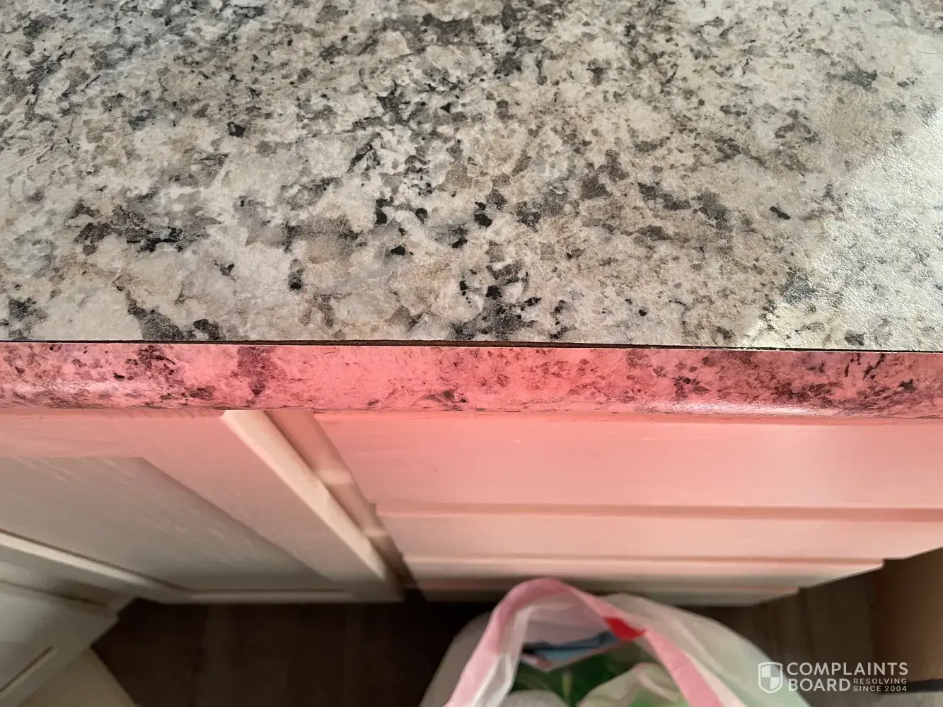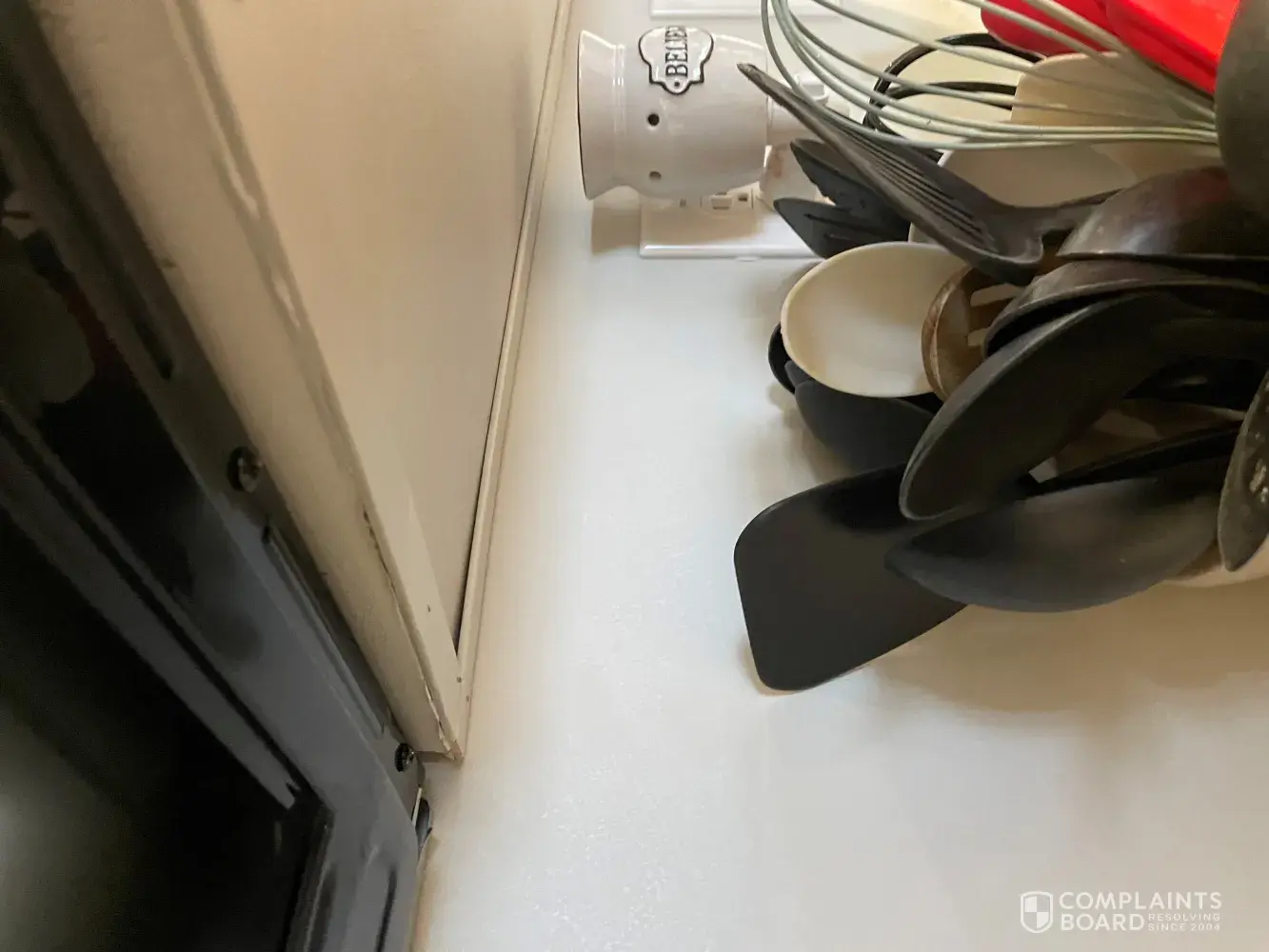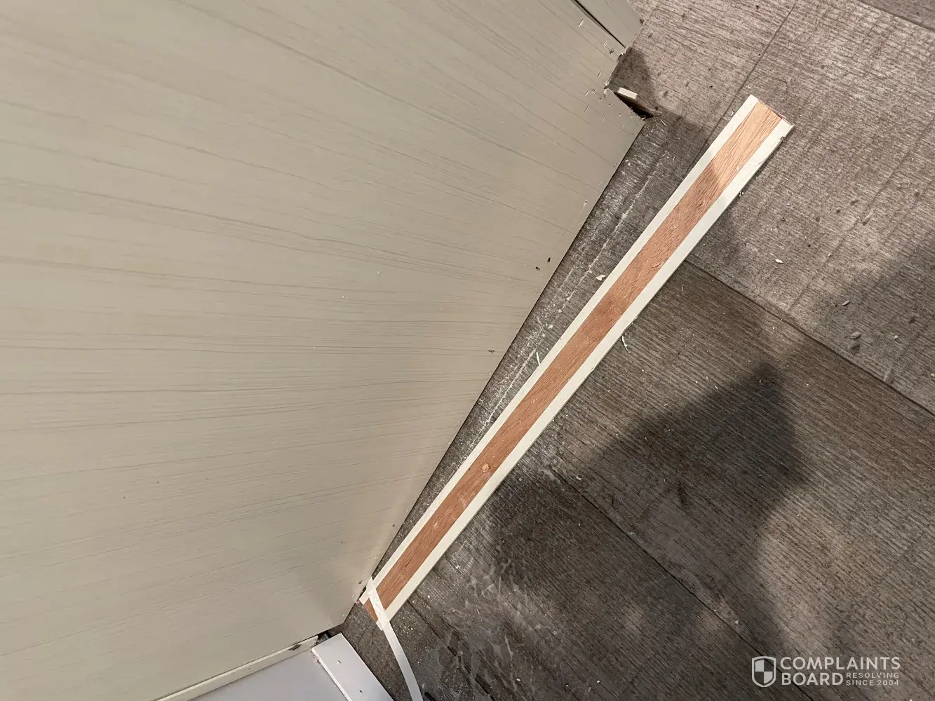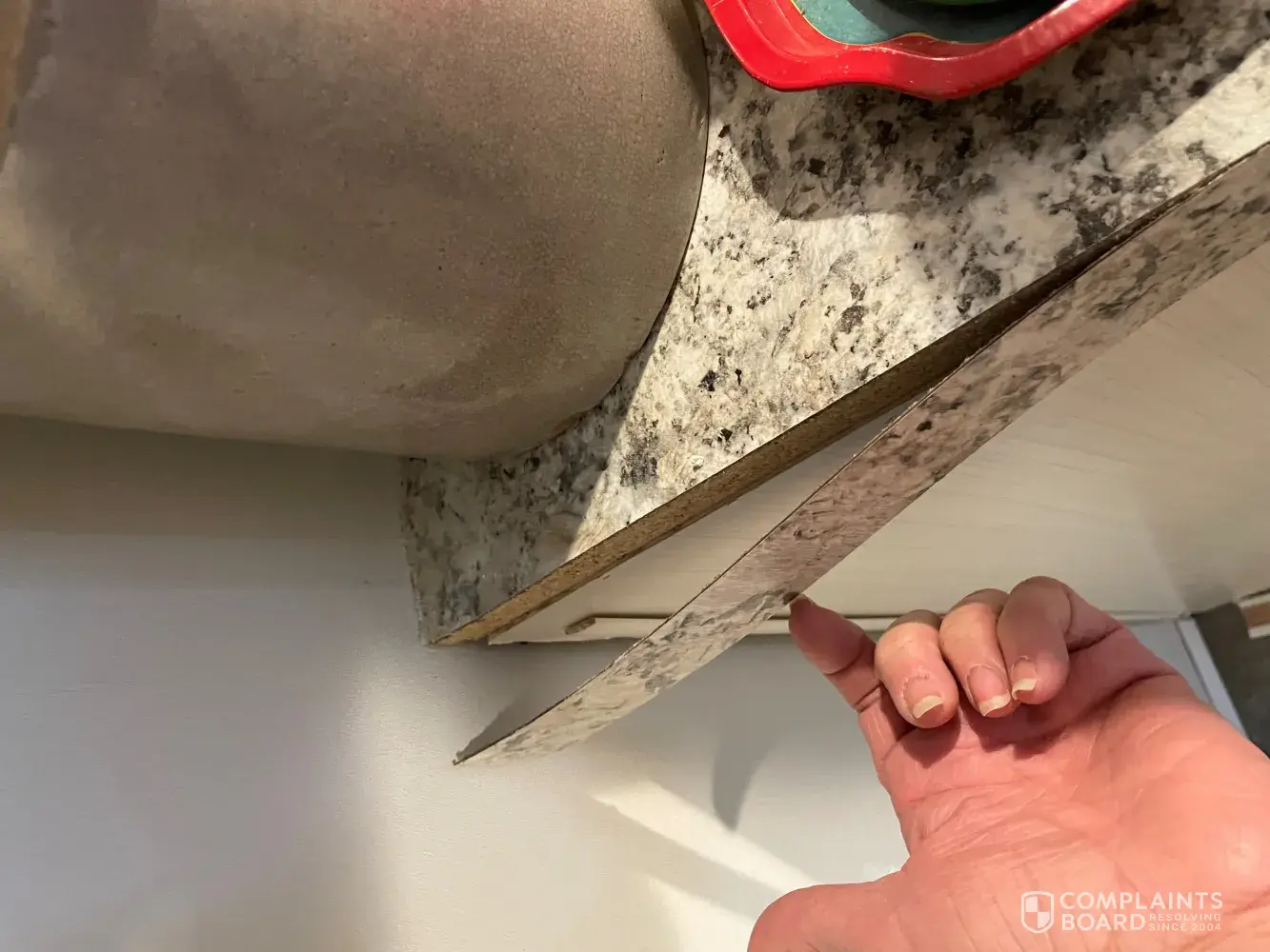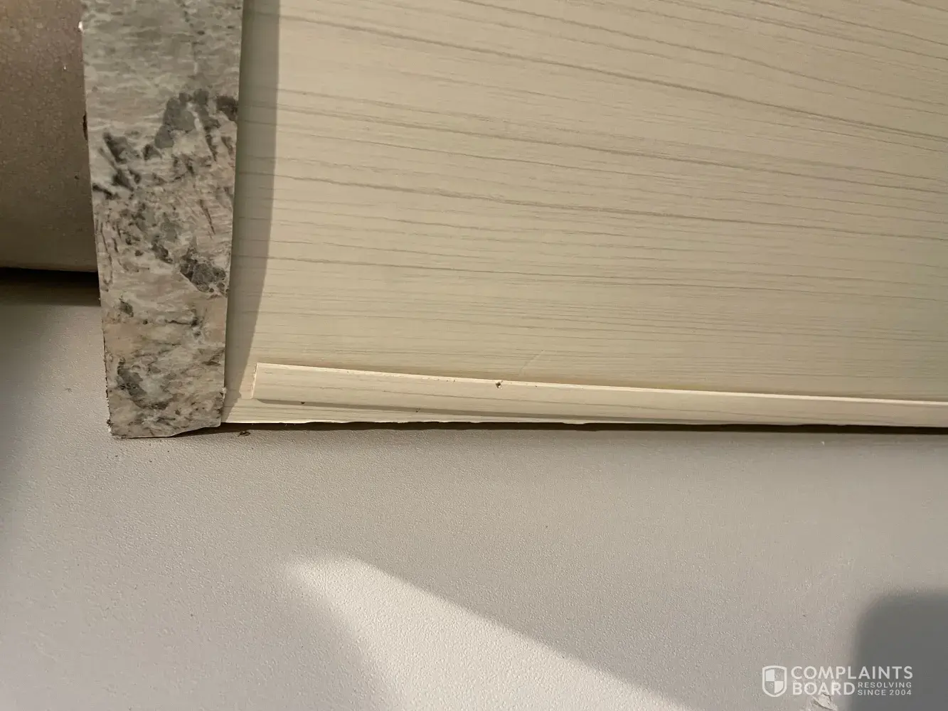 When they finely sent someone to "come fix" the problems. I kid you not literally just used caulking and glue. The walls weren't fixed, I still had tacky cover ups, and they didn't fix the wallpaper that's bubbling up throughout the house. The one counter was "fixed". But all he did was lift it up from the bottom and put broken trim pieces underneath it until it was "leveled". Same for my stove. I can go all day with the problems with this house. I'd save you the hassle of even considering buying. I've got more pictures on my phone this isn't even the half of it.