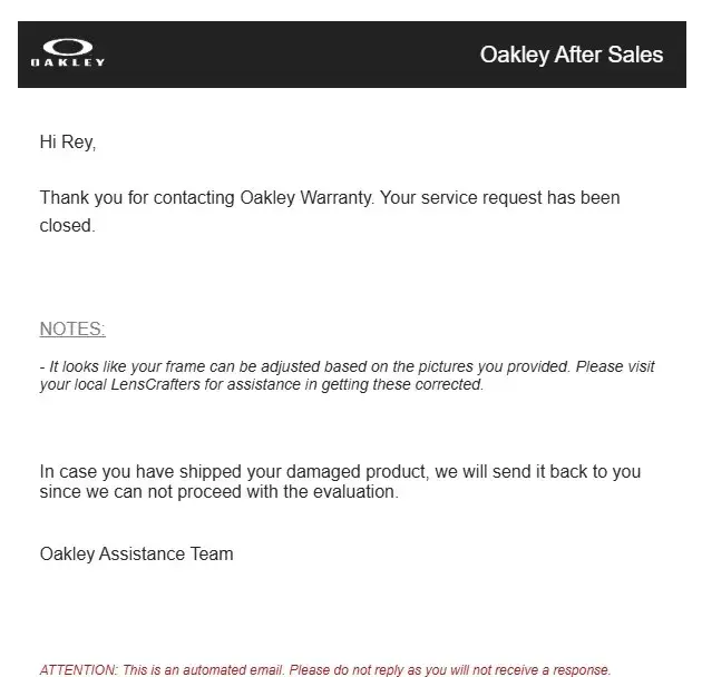 I created a claim online to get my Sunglasses fixed. Send all pictures of what needs to be done cause a lens fell of the frame. I did not asked for a free repair even when my wife bought them directly from Okley, I just wanted an estimate for repairs and to fix them. Only took them a day to send a message that for the looks like, I just need to take them to a local lens crafter and closed my case, and they said that if I already shipped them, they will just send them back to me. What kind of Service is this crap company runs? I have been loyal to buy only Okley, I guess its time to just let them go and find better gear somewhere else.