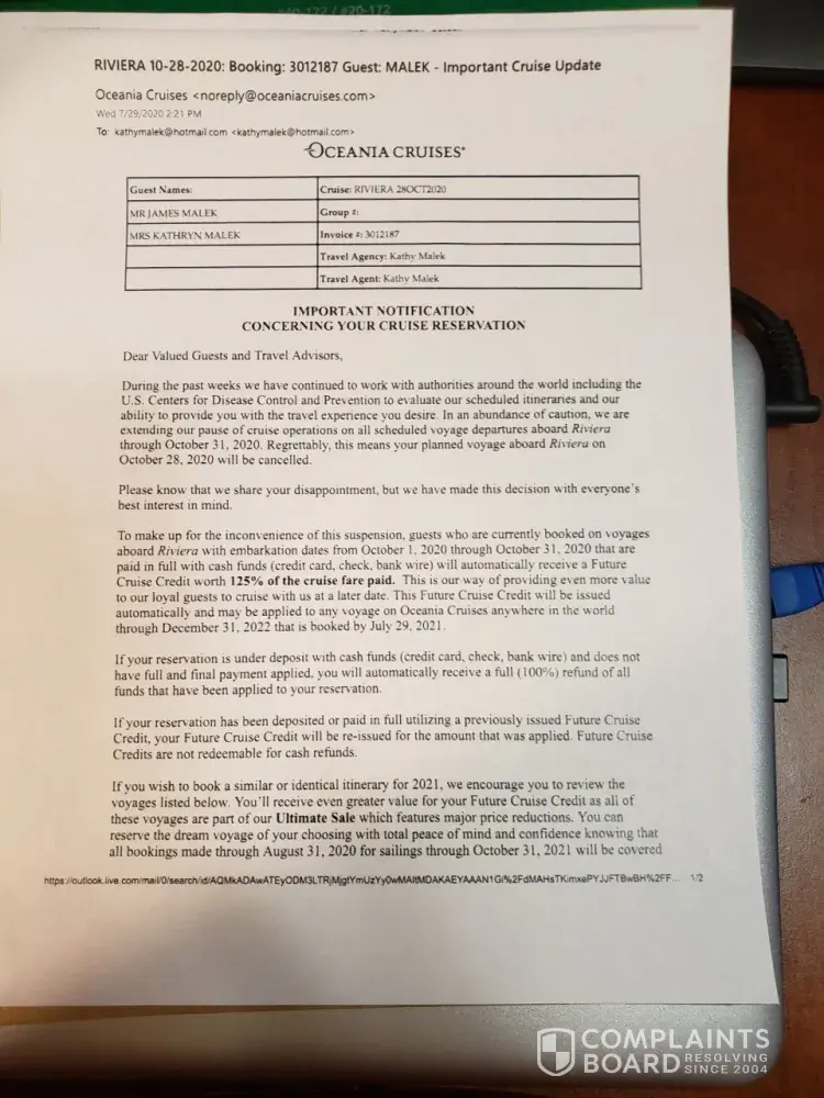 Booked a cruise in November 2019 for a March 2020 cruise. This was for my 30th wedding anniversary. The March cruise was cancelled by Oceania due to COVID. Thinking that the world would be back to normal by October 2020, I rebooked the cruise. On July 29, 2020, I received an email from Oceania stating that this cruise was cancelled as well. I called by...