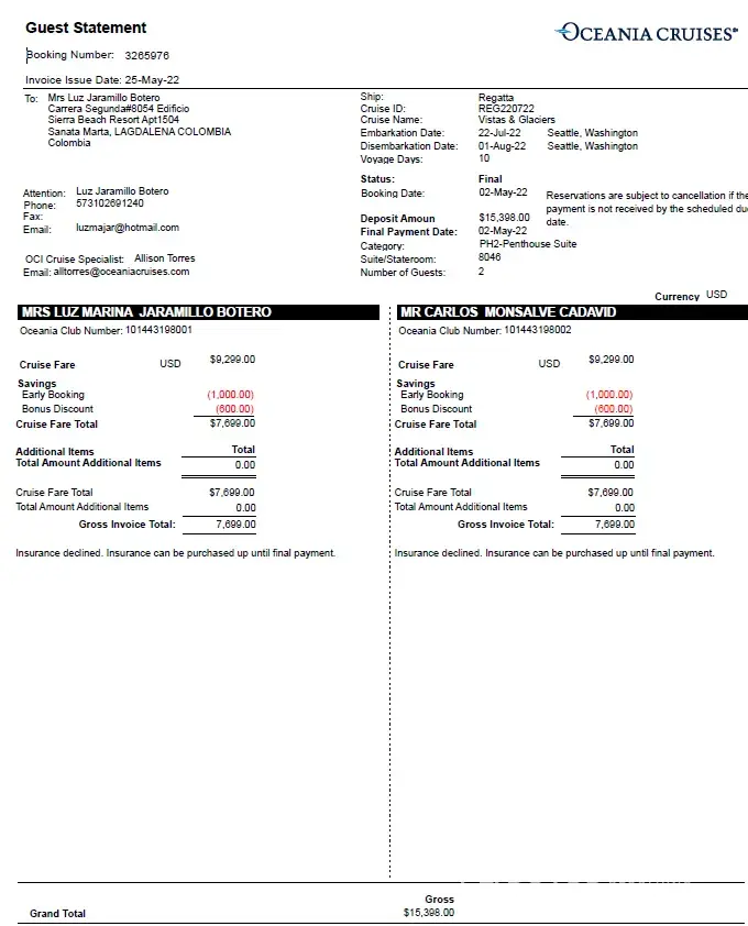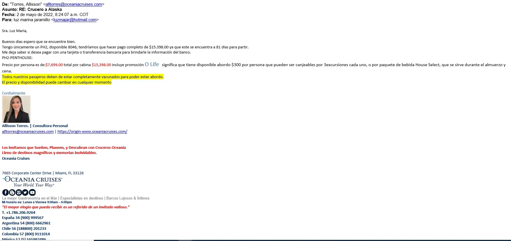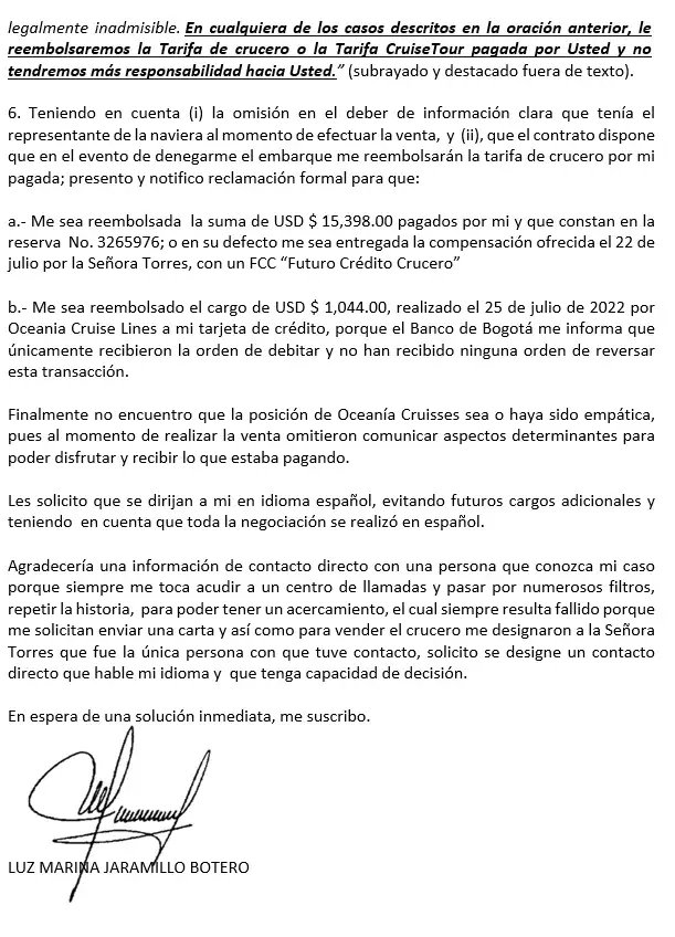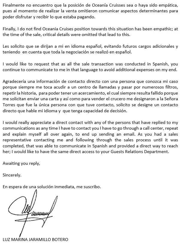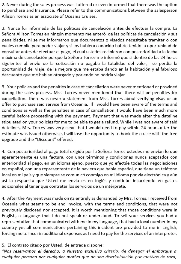 As the cruise was purchased in Colombia, and the sales representative does have a local number in my country I expected the disclosure of the terms and conditions prior to my purchase and in the same language all the negotiation was conducted.