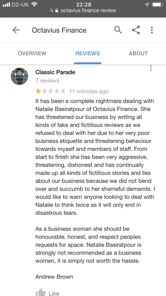 Has anyone read Natalie Basiratpours of Octavius Finance Google Reviews? She needs to be reported to the Mental Health Authorities alongside the Police- This woman is MAD!. If you don't give have a Supercar for £600 you then get your brand ruined. Honestly she is bloody mad.