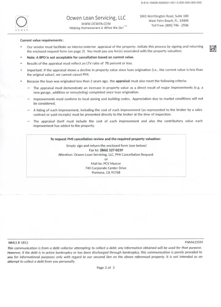 A couple of weeks pass and i get a reply from Ocwen that i was declined on my request to drop PMI. I looked at the appraisal report and with it and my loan amount, I was at 74% LTV. So i called in to the company to let them know that there must have been a mistake, and they said they would review it.
