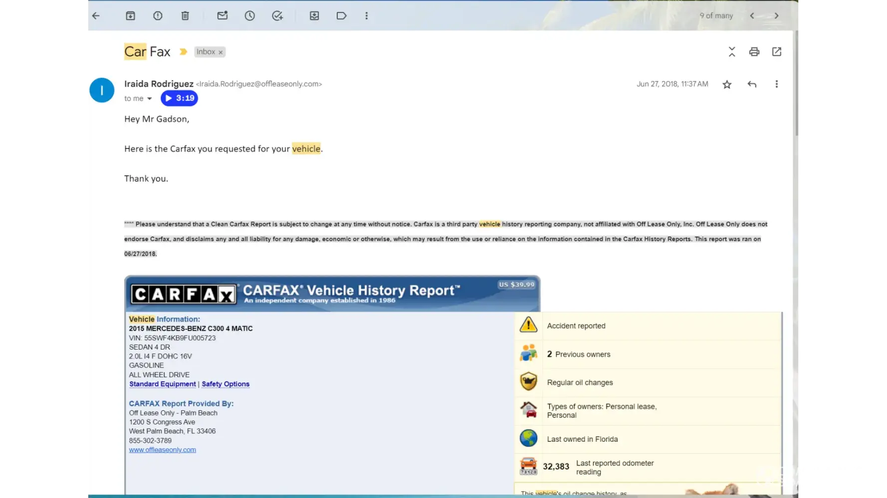 Off Lease Only (OLO) sold T.R. Gadson a MB C300, claiming it had a clean Car Fax and sound title. In fact, a representative sent me the Car Fax and it stated everything was guaranteed good. I purchased the car for $30,000. Furthermore, I have paid off the loan completely. Currently, the vehicle should be worth @ $15,000 in the used car market.
