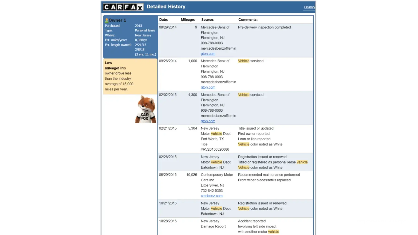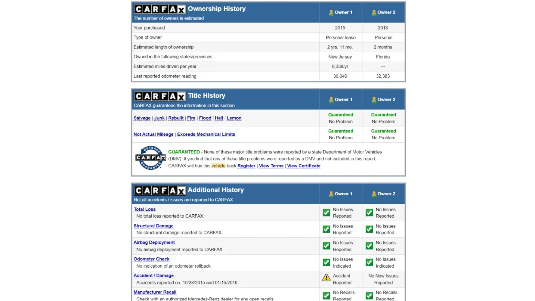 About 3 years ago, my daughter purchased a Mercedes 2 door from off lease. At the time of the purchase the CarFax report was clean. However, 2 weeks ago she goes to trade it in for another car and was told by two dealerships that the car was in a car wreck and had frame damage. When she goes to look up the car on CarFax the date on CarFax showed that it was submitted after her purchase date. She owes about 6000 more on the car. I wouldn't recommend anyone purchasing a car from off lease.