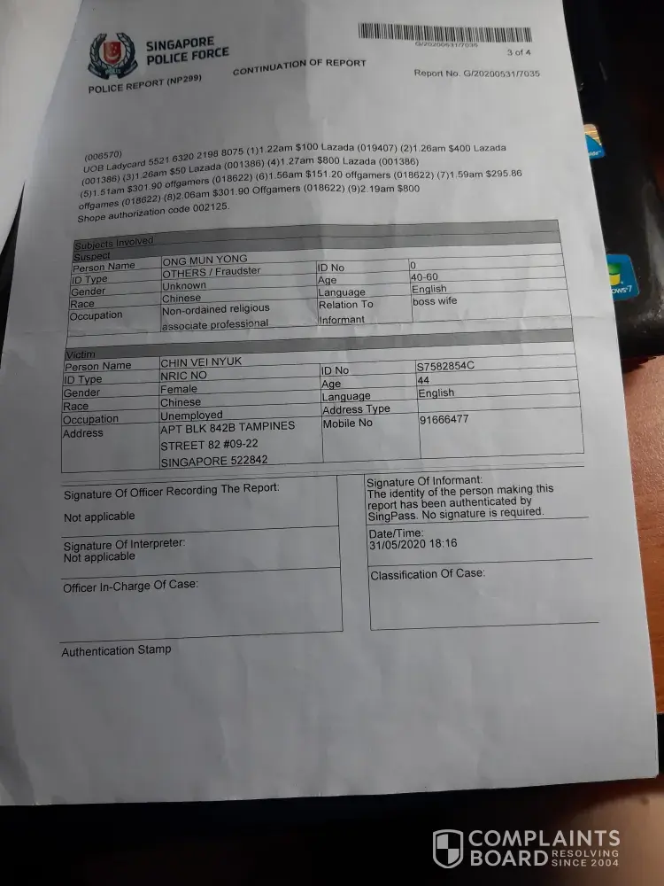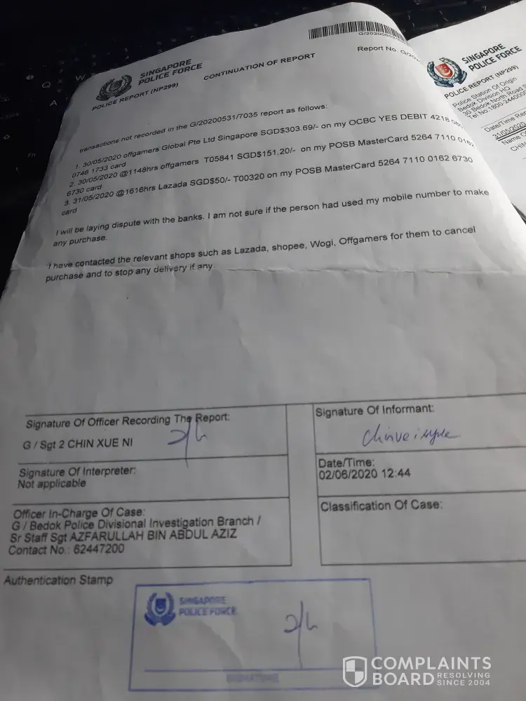 My name chin vei nyuk, fraudster cheat me using my credit card go to your offgamers buy goods, 11 item total amount $2572.31, I write email to [protected]@offgamers.com tell stop the transaction and cancel sent out the goods. I have two police report, I hope your company refund the money to the bank and bank return money to me. I was jobless and layoff, I hope your director and ceo leonard c approval and agree the money to me. I have contract your company in in k. L, the person in charge rock size and wai joe tung (don't want refund money) and also go to singapore branch 17 circular road, but don't have this company. I hope your branch in singapore help me refund the money and stop all the transaction and contract [protected]@gmail.com as soon as possible. My police report have my contract no, please help me solve this problem because I worry it till cannot eat and drink and sleep well.