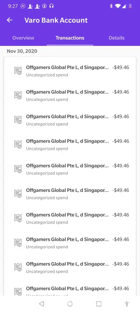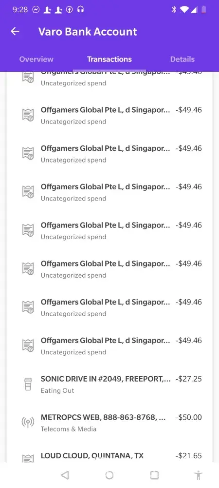 My name is Joseph Baker. I have never heard of Offgamers Global and I have never used their services or bought whatever it is they sell, but I was charged $49.46 to my Varo card ending in 4418 20 times consecutively on November 29, 2020. These were not made by me and they were not authorized by me either. The total of the charges is $989.20. I need this money back immediately. I have attempted to contact this company to no avail and notified Varo Bank but neither have yielded results.