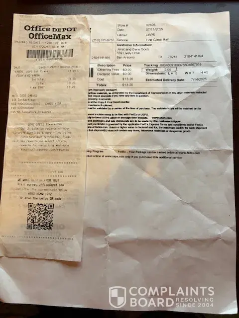 I mailed a card on 7/11/2025 at my Office Depot, Crossroads Blvd., San Antonio TX. Sara, the associate that helped me charged me for a 2 pound package rather than a 2 ounce package -- it was a birthday card I was mailing. When I told her I thought the amount was really high for mailing a card - $13.20, she just made a comment that things were going up in...