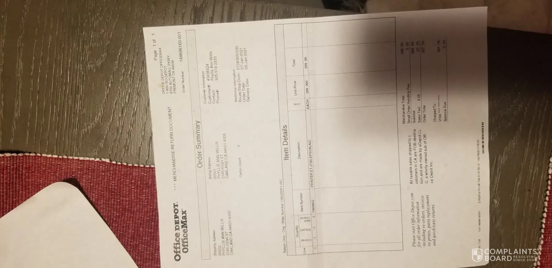 Falls Dr Anna Texas 75409. I received email that it has been cancelled. Today I talked to Office Depot Representative and she said that order has been cancelled and money has been refunded in the bank. My complaint is: