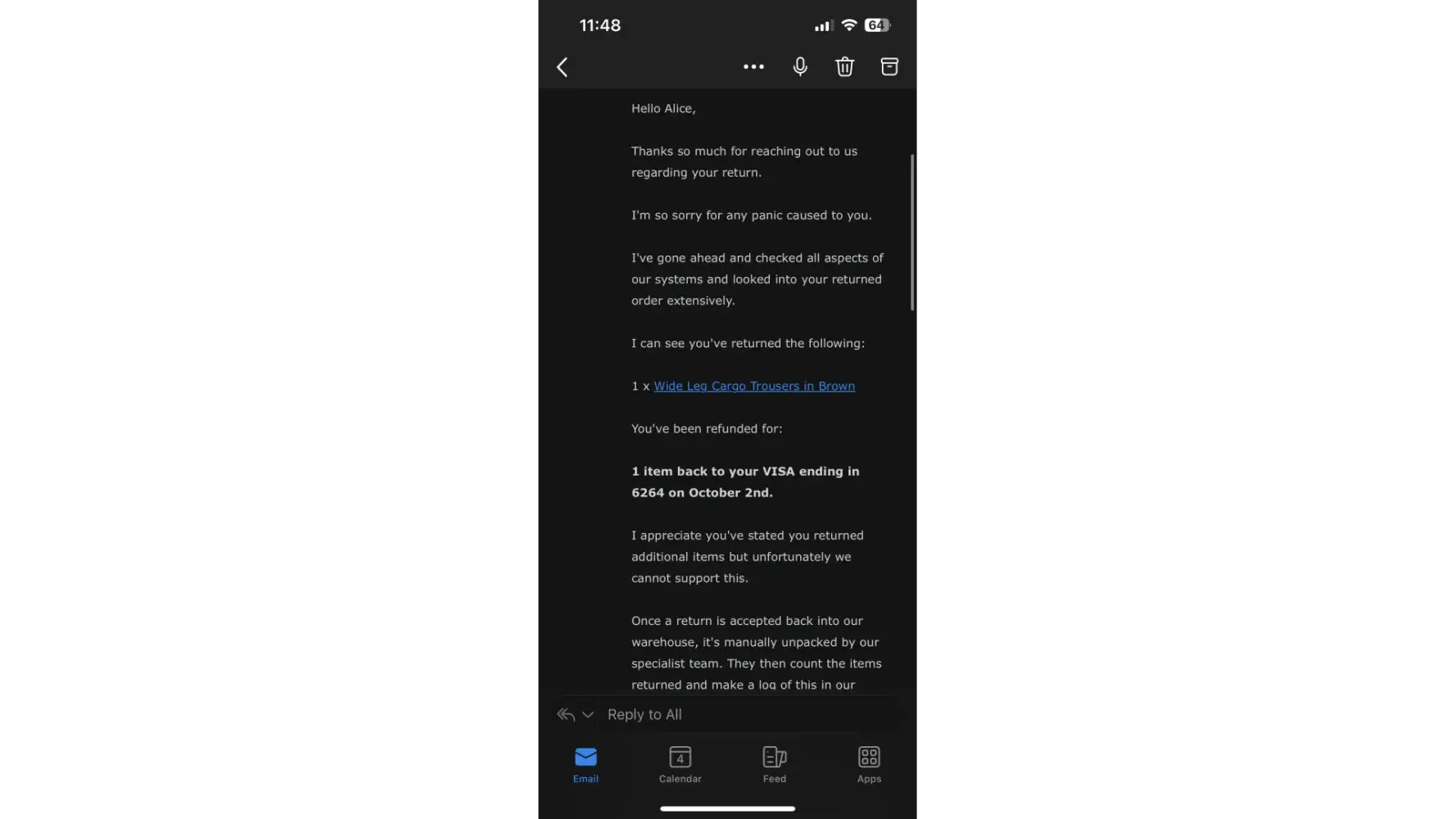 I bought two dresses and a pair of cargos and only kept one dress for my birthday. I returned the other two items in the SAME parcel as instructed. And they are refusing to refund the dress claiming they haven’t received it. But they have returned the cargos WHICH WERE IN THE SAME BAG. Been in contact with them and they’re outright saying it was never in there so I don’t have the dress or the money. Honestly an absolute rip off. I’ve always shopped at oh Polly but the overall quality of products, customer service and just general how they treat their customers is in the bin. Don’t shop here you won’t get your money back.