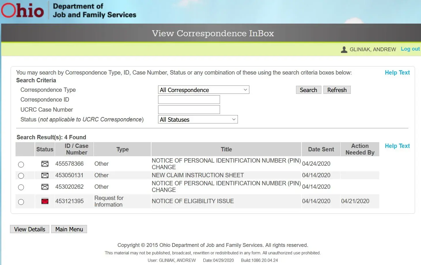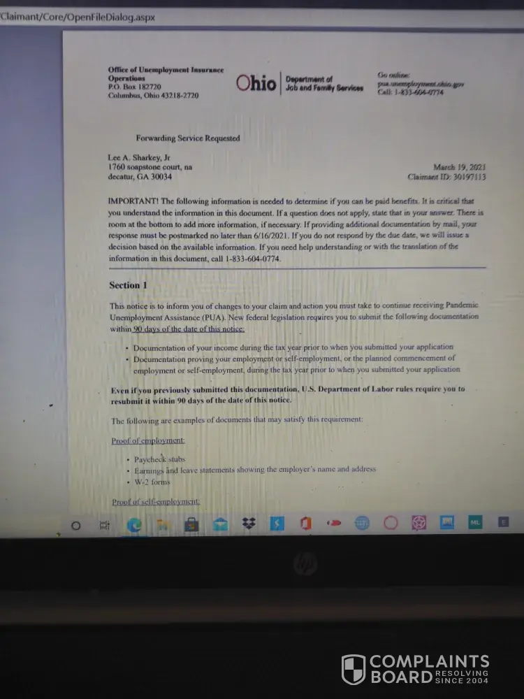 It is impossible to get in contact with Ohio Unemployment Services. I filed on 4/13/20. I left work at Cabela's, Avon, Ohio on 3/18/20. My claim number is CA30-[protected]. The day after I filed my claim I saw that I had a correspondence from the Unemployment Service. However I could not view it. Everytime I tried I got an error message and I tried many many times, over weeks. I have called so many times. I have waited over hours many times. Once I just left the phone on speaker and decide to wait as long as it takes and I did get through. But the people said I had to talk to another department, OK. But then I just got put in the hold cycle again and gave up after a long time.