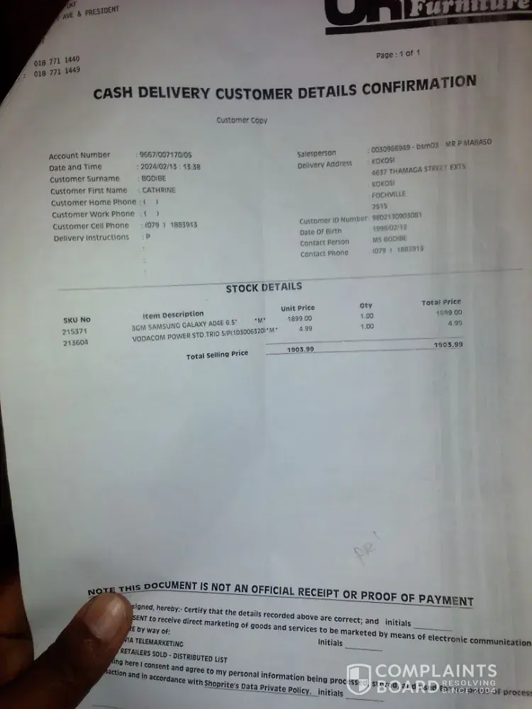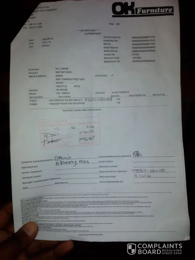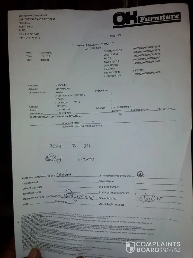 On 13 February 2024 I bought a samsung A4 phone IMEI1:[protected] at Fochville OK Furniture and with 24 months warranty but after 4 days it had a technical problem and the manager was very rude toward me and instead she said is none of her business and if I have any complain I can go to court and settle the matter out of court.