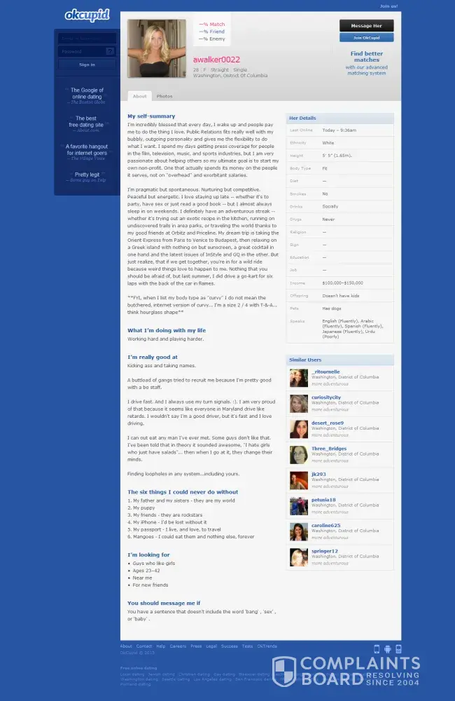 Decided to try OkCupid and there was something wrong about this website. I was chatting with three girls and their behavior and questions and texts, everything was strange. I felt like I was talking to a robot. Then I made a little research and found out that there are many fake profiles on OkCupid. And these guys steal photos from Facebook to create more fakes! This is absolutely illegal and sites like this one should be investigated and shut down!