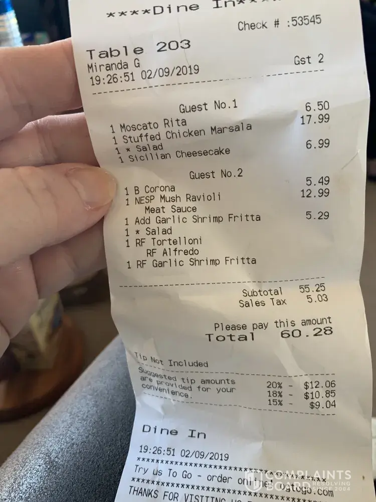 The food was incorrect no one at the restaurant answered when we tried to call in and speak with management regarding the order. I basically feel like we wasted our money. check#68260 the order was incorrectly made and we received bread sticks which were toasted so well done they were too hard to eat. I would like this resolved by having my order replaced...