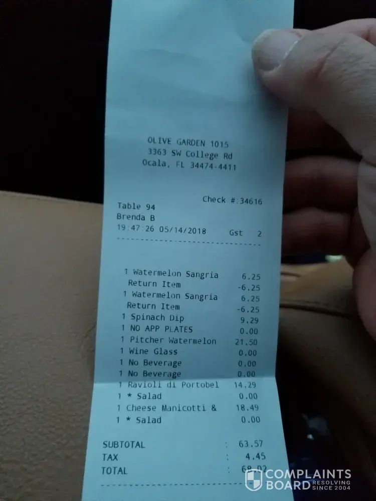 I am complaining about the terrible service I received at my local olive garden.