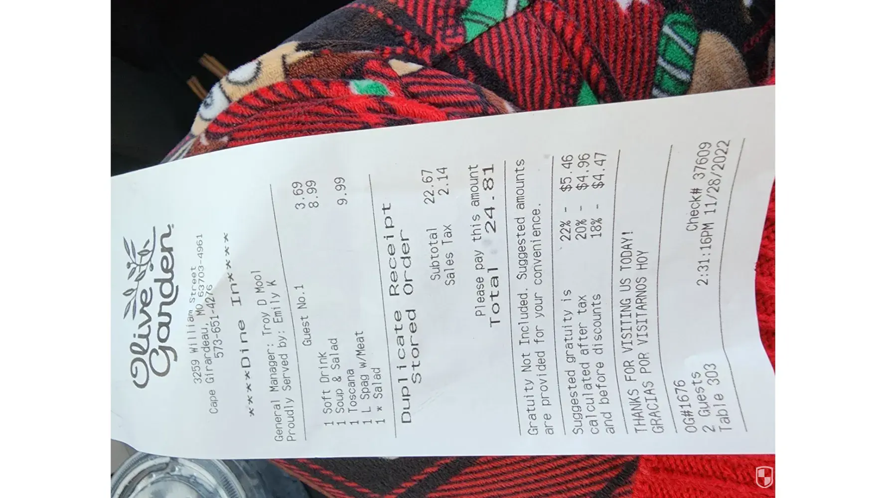 My husband and I ate at Olive Garden. In Cape Girardeau, Mo. Date 11/28/2022: check #37609, table 303. He ordered soup and breadstix and salad, I ordered Spaghetti w/meat sauce. This has been our 3rd visit in 6 weeks to this location. 1st visit I had to ask for sauce I had almost white Spaghetti I received quickly and hot, 2nd visit the sauce on the...