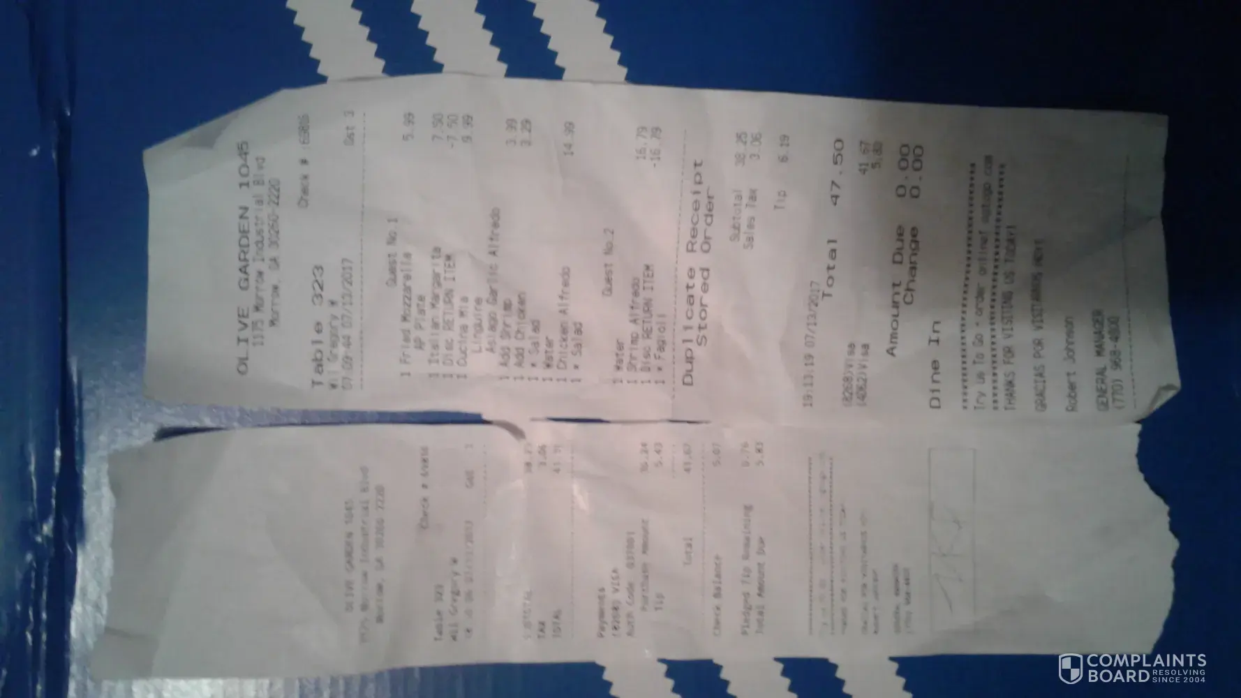 My husband and I visited the olive garden in clifton park, ny today. The waitress was very nice. We ordered our drinks and food. Our server asked us if we would like dipping sauce with our bread sticks, such as marinara or Alfredo. We said sure, both would be nice. Well... She never told us there was a charge of $3.49 for each! We couldn't believe it when we received the check. She had offered it sounding like it was complimentary. We paid and left, didn't say anything. When we went to the parking lot the next table over was talking about the same thing happening to them! So I searched complaints on line and sure enough the same complaint from other people are on line. I truly feel like I had one pulled over on me! So then I decided to call the store to let the management know what happened. Her name was Jessica. She had me on speaker and heard someone laughing in the background. When the girl really started laughing at the end of our conversation she picked the phone up and took me off speaker! That was the management! She offered a gift card, I said I didn't call for any compensation I just do not want the same thing happen to the next family going there. I'm totally disgusted!