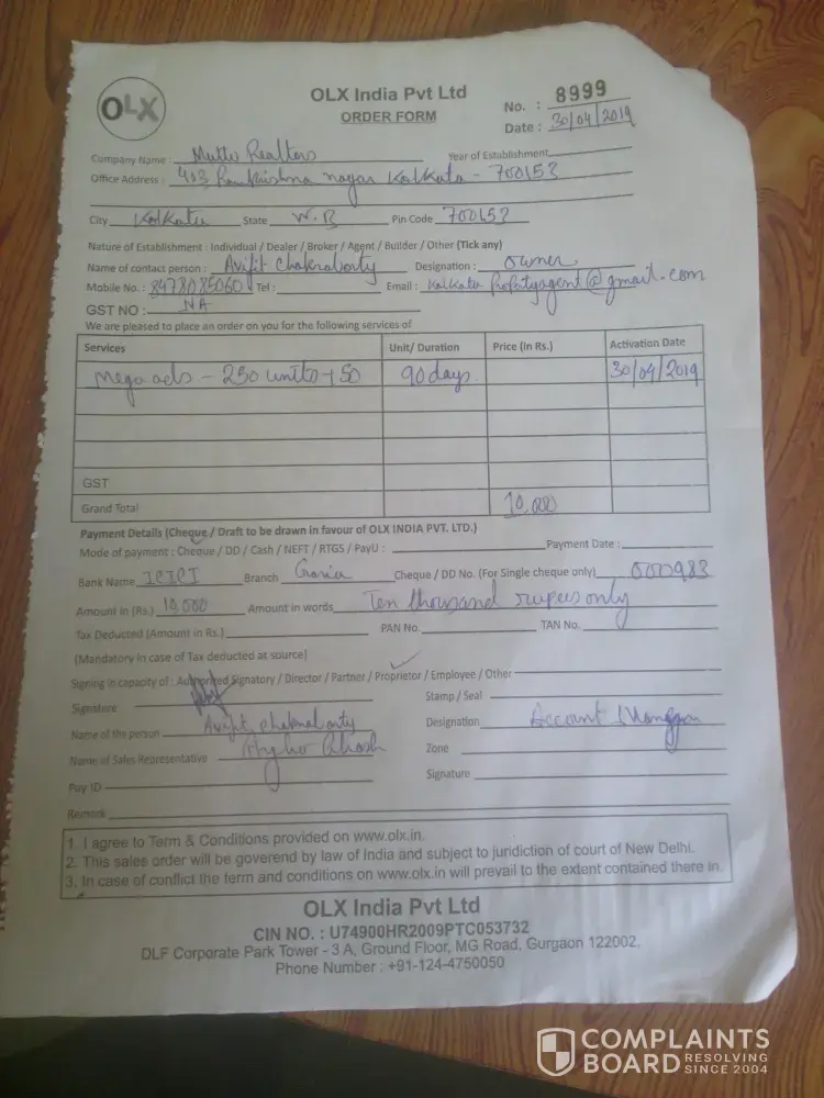 I avijit chakraborty real estate dealer, garia, kolkata-153, last 30/04/2019, I purchased a 300 listing package, from mr. Argha ghosh (account manager). My cheque number is.000983, icici bank, garia branch, rs.10, 000/-. Order form no.8999, but yet I can't operate due to insufficient funds, please I need your cooperation, as soon as possible please start this package. Sending you a photo copy of my order form, olx got the rs.10, 000/-. Few days ago.