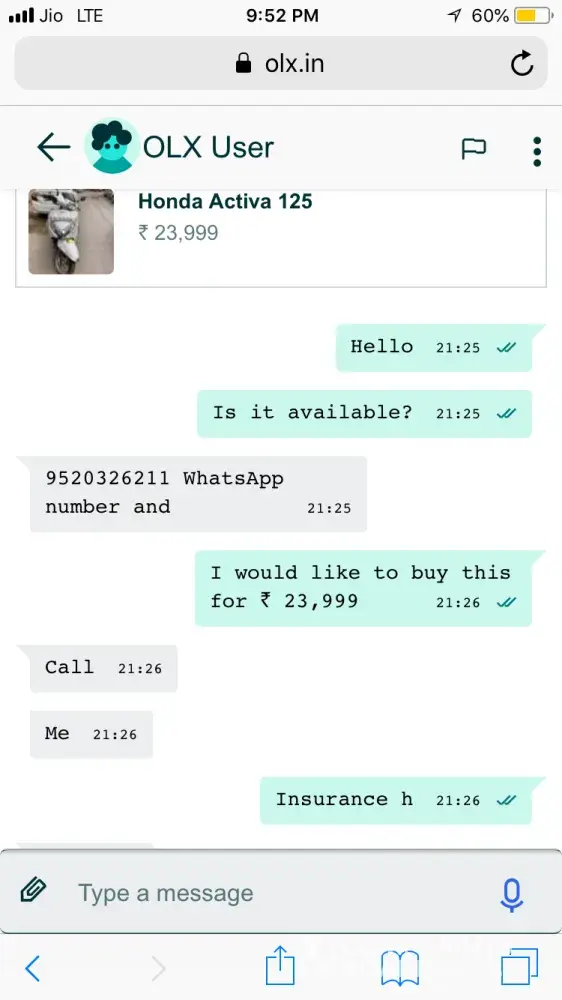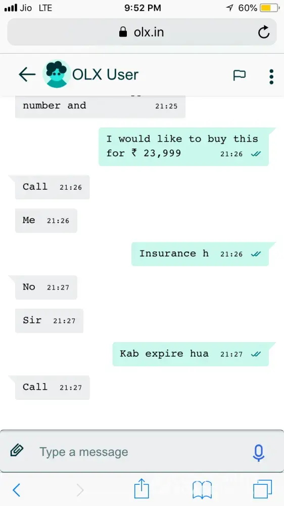 Some one is cheating with people after putting bullet selling offer on olx. So please help me to arrest this guy because he is using indian army name for cheating. Below is the new chat and earlier he putted another one and he cheat me 60000 rupees. So please help me to recover this amount and help to arrest this person who is insulting our indian army. So please help in arresting this guy. For full details please whatsapp call me on +91 [protected]